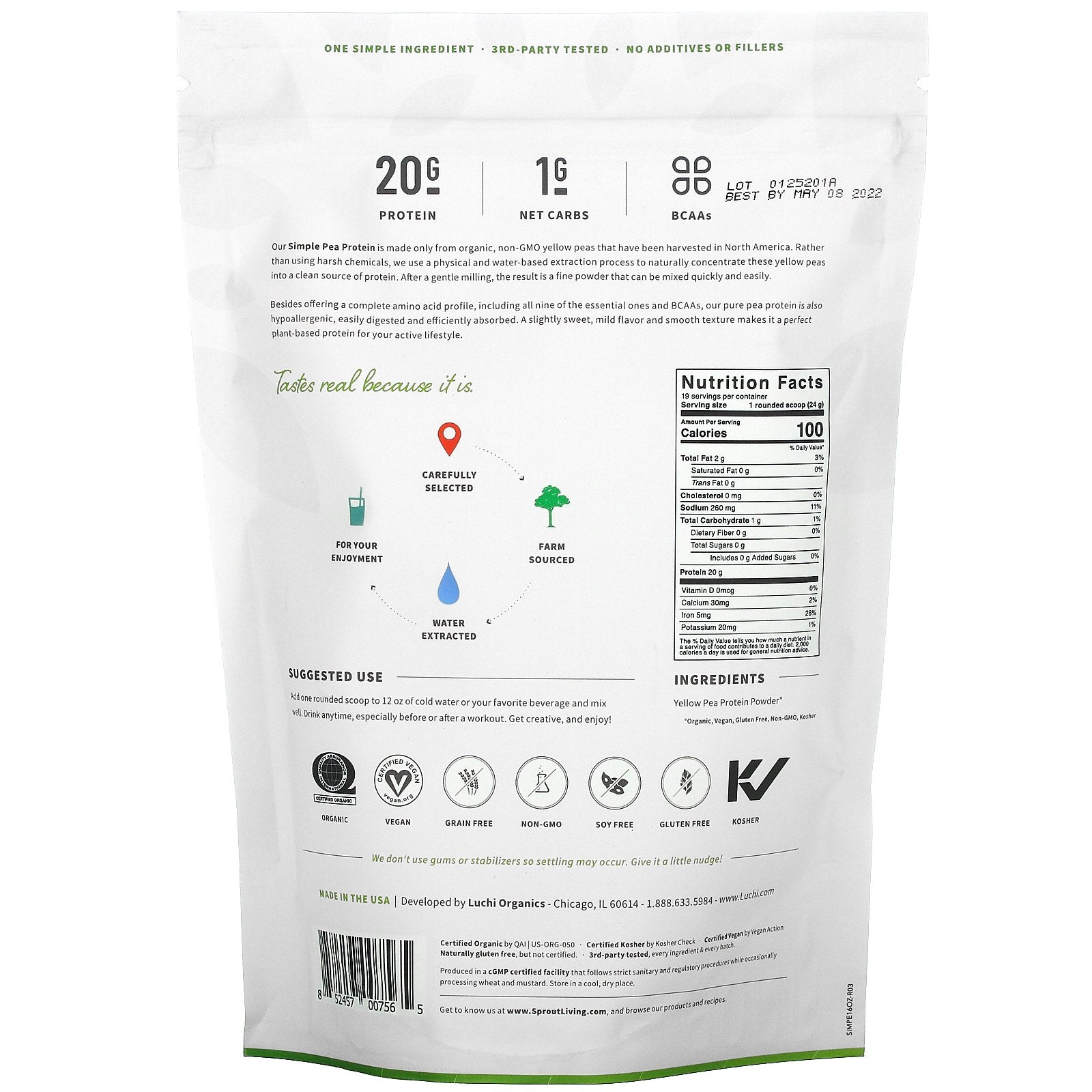 Made with the Finest Yellow Peas Sprout Living - Plant Life to Thrive USDA 20g Protein Keto & Paleo Friendly Zero Additives Free of GMOs, Grain, Dairy, Nuts, Gluten & Soy Made Fresh & 3rd-Party Tested in the USA One Simple Ingredient No Additives or Fillers 1 g Net Carbs BCAAs Grain Free Non-GMO Soy Free Certified by QAI Certified Kosher by Kosher Check Certified Vegan by Vegan Action Naturally Gluten Free, but not Certified 3rd-Party Tested, Every Ingredient & Every Batch Pure & clean plant-based protein powder with a powerful array of essential amino acids. Our Simple Pea Protein is made only from , non-GMO yellow peas that have been harvested in North America. Rather than using harsh chemicals, we use a physical and water-based extraction process to naturally concentrate these yellow peas into a clean source of protein. After a gentle milling, the result is a fine powder that can be mixed quickly and easily. Besides offering a complete amino acid profile, including all nine of the essential ones and BCAAs, our pure pea protein is also hypoallergenic, easily digested and efficiently absorbed. A slightly sweet, mild flavor and smooth texture makes it a perfect plant-based protein for your active lifestyle. Tastes real because it is. Carefully Selected - Farm Sourced - Water Extracted - For Your Enjoyment