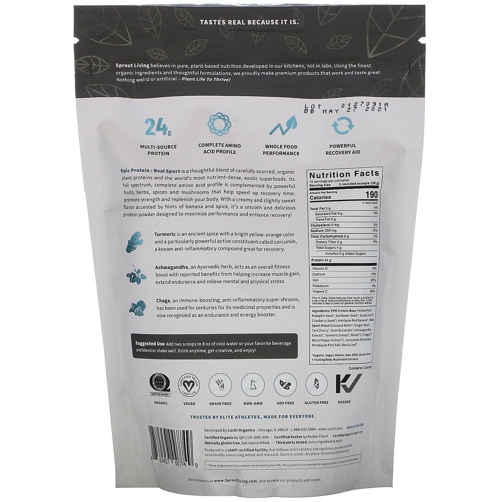 Yellow Pea Pumpkin Seed Sunflower Seed Sacha Inchi Cranberry Seed Heirloom Red Banana Coconut Water Ginger Root Tart Cherry Acerola Ashwagandha Turmeric Reishi Chaga Black Pepper Jerusalem Artichoke Himalayan Pink Salt Stevia Leaf Plant Life To Thrive USDA Certified Vegan 24 g Plant Protein Non-GMO Gluten-Free No Gums or "Flavoring" Made Fresh & Third Party Tested in the USA Tastes Real Because It Is. 24 g Multi-Source Protein Complete Amino Acid Profile Whole Food Performance Powerful Recovery Aid Quality Assurance International - Certified Grain Free Soy Free Kosher Trusted by Elite Athletes, Made for Everyone Certified by QAI Certified Kosher by Kosher Check Certified Vegan by Vegan.org Naturally Gluten Free, but Not Certified Third Party Tested, Every Ingredient & Batch Sprout Living believes in pure, plant-based nutrition developed in our kitchens, not in labs. Using the finest ingredients and thoughtful formulations, we proudly make premium products that work and taste great. Nothing weird or artificial - Plant Life To Thrive! Epic Protein: Real Sport is a thoughtful blend of carefully sourced, plant proteins and the world's most nutrient-dense, exotic superfoods. Its full spectrum, complete amino acid profile is complemented by powerful fruits, herbs, spices and mushrooms that help speed up recovery time, promote strength and replenish your body. With a creamy and slightly sweet flavor accented by hints of banana and spice, it's a smooth and delicious protein powder designed to maximize performance and enhance recovery. Turmeric , is an ancient spice with a bright yellow-orange color and a particularly powerful active constituent called curcumin, a known anti-inflammatory compound great for recovery. Ashwagandha , an Ayurvedic herb, acts as an overall fitness boost with reported benefits from helping increase muscle gain, extend endurance and relieve mental and physical stress. Chaga , an immune-boosting, anti-inflammatory super-shroom, has been used for centuries for its medicinal properties and is now recognized as an endurance and energy booster.