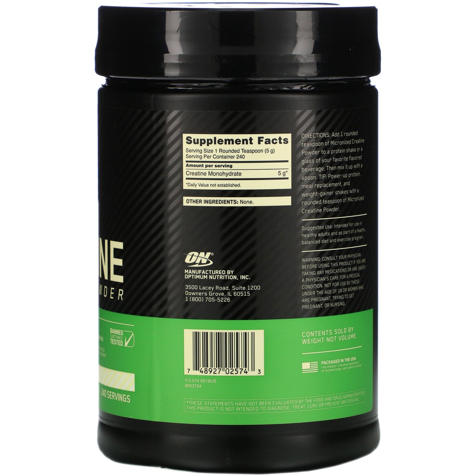 For Muscle Building Support 100% Pure Creatine Monohydrate Supports Explosive Movements 5 g Per Serving Supports Muscle Strength Power Banned Substance Tested Creatine Supplement 240 Servings Informed Choice - Trusted by Sport Creatine Monohydrate Provides 5 g of 100% pure Creatine Monohydrate - one of the most widely studied supplement ingredients - to help support ATP recycling for explosive movements. Creatine Monohydrate supports muscle building, recovery, performance, strength and power when used daily, over time and combined with exercise. Optimum® Nutrition has been trusted to provide the highest quality in post-workout recovery, pre-workout energy, and on-the-go sports nutrition for over 30 years and in 80+ countries. After careful supplier selection, each ingredient is tested to assure exceptional purity, potency and composition. We hold ourselves to the highest production standards, all so you can unlock your body's full potential. Creatine supports muscle building when taken over time with exerciseSugg. UseDirections :...