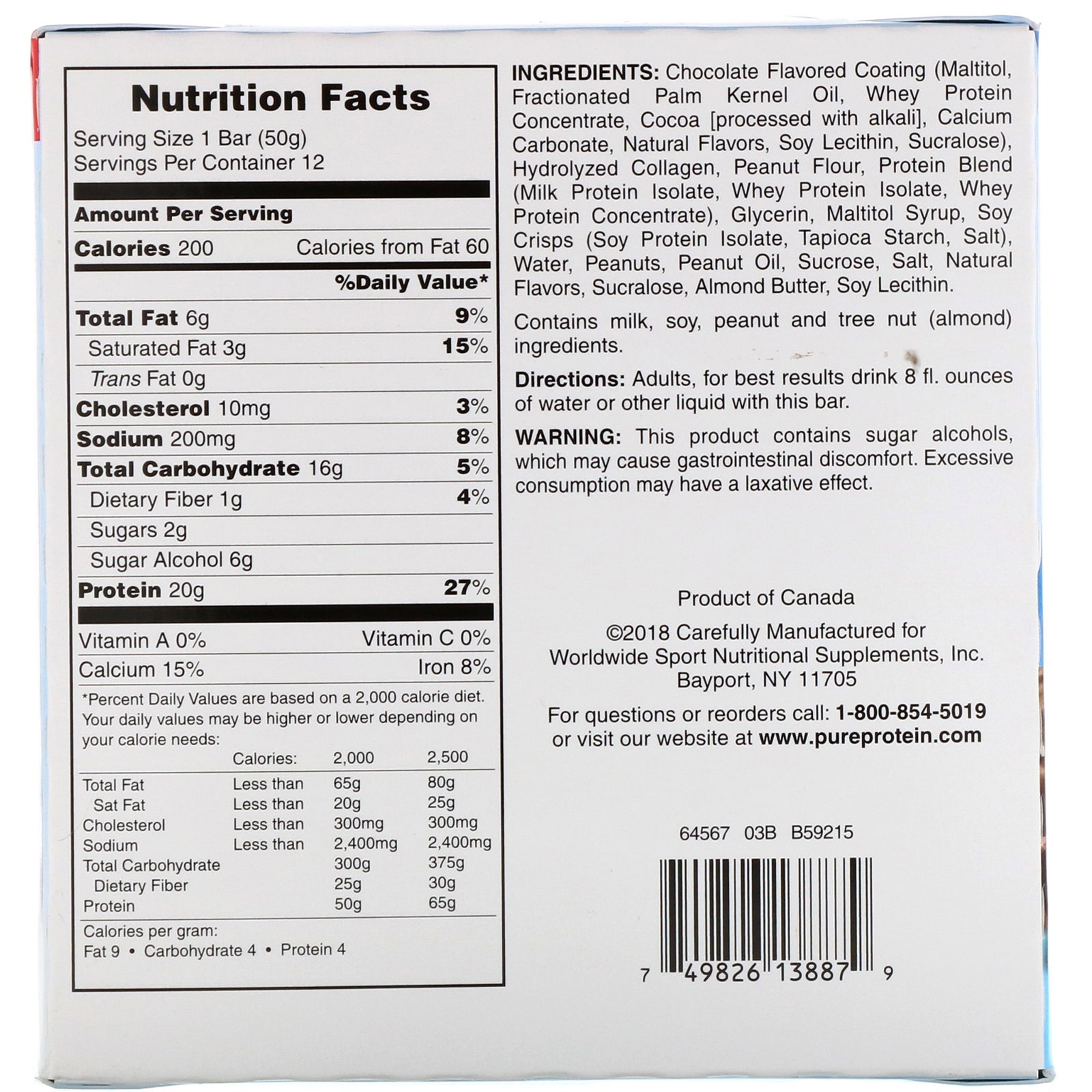 Value Pack 20 g Protein - 2 g Sugar - 200 Calories Gluten FreeSugg. UseAdults, for best results drink 8 fl. ounces of water or other liquid with this bar.Other IngredientsChocolate flavored coating (maltitol, fractionated palm kernel oil, whey protein concentrate, cocoa [processed with alkali], calcium carbonate, natural flavors, soy lecithin, sucralose), hydrolyzed collagen, peanut flour, protein blend (milk protein isolate, whey protein isolate, whey protein concentrate), glycerin, maltitol syrup, soy crisps (soy protein isolate, tapioca starch, salt), water, peanuts, peanut oil, sucrose, salt, natural flavors, sucralose, almond butter, soy lecithin. Contains milk, soy, peanut and tree nut (almond) ingredients.Supplement FactsServing Size: 1 Bar (50 g) Servings Per Container: 12 Amount Per Serving %Daily Value* Calories 200 Calories from Fat 60 Total Fat 6 g 9% Saturated Fat 3 g 15% Trans Fat 0 g Cholesterol 10 mg 3% Sodium 200 mg 8% Total Carbohydrate 16 g 5% Dietary Fiber...