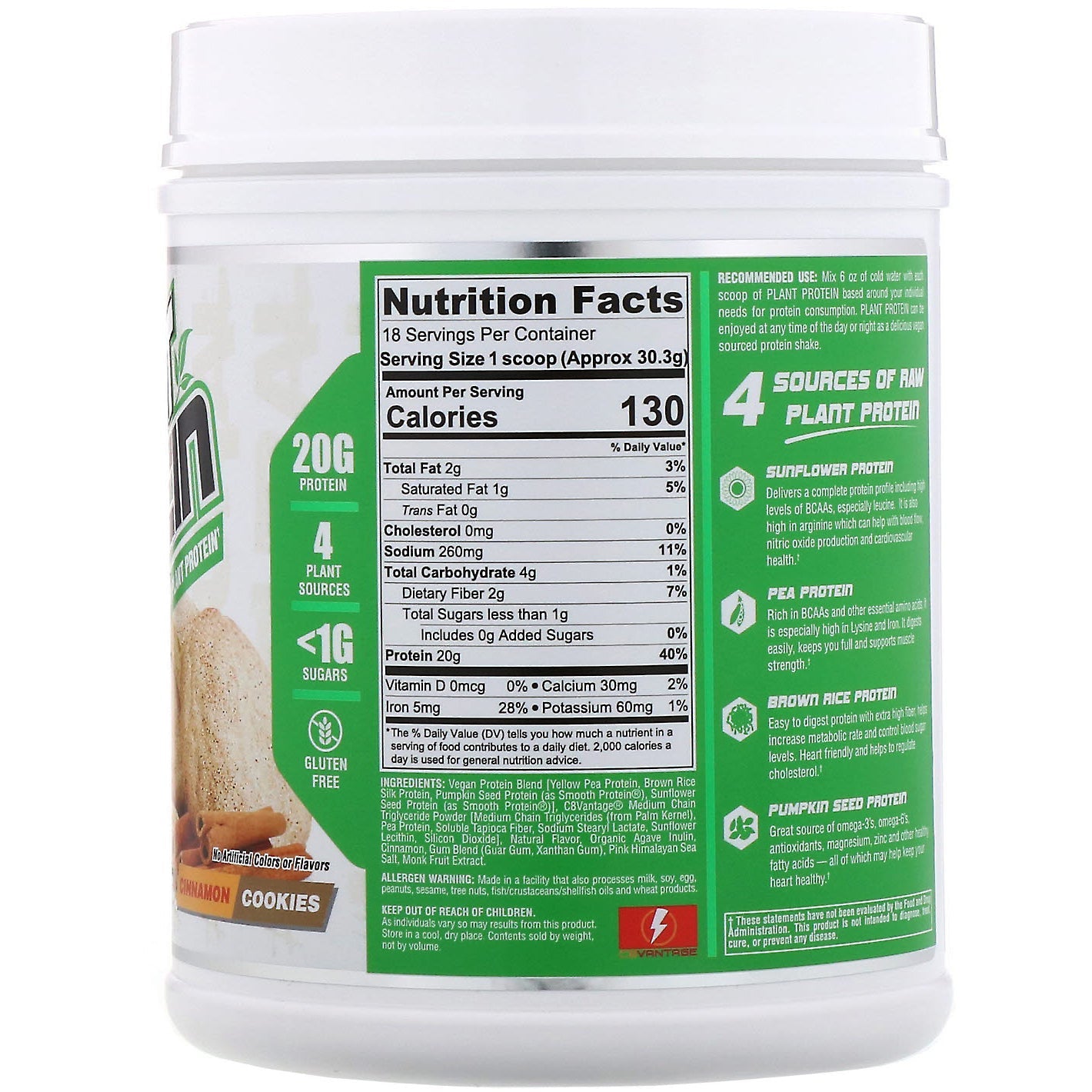 Vegan protein blend [yellow pea protein, brown rice silk protein, pumpkin seed protein (as smooth protein), sunflower seed protein (as smooth protein)], c8vantage® medium chain triglyceride powder [medium chain triglycerides (from palm kernel), pea protein, soluble tapioca fiber, sodium stearyl lactate, sunflower lecithin, silicon dioxide], natural flavor, organic agave inulin, cinnamon, gum blend (guar gum, xanthan gum), pink himalayan sea salt, monk fruit extract. Allergen Warning: Made in a facility that also processes milk, soy, egg, peanuts, sesame, tree nuts, fish/crustacean/shellfish oils and wheat products.Supplement Facts