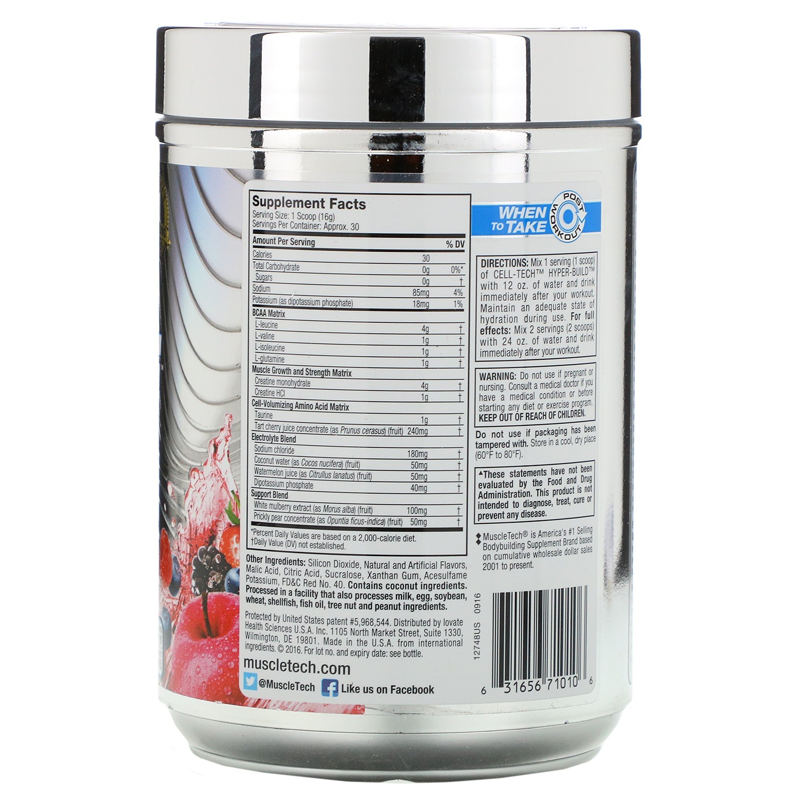 Performance Series Superior Science Superior Results 5-in-1 Powerful Post-Workout Formula Research & Development America's #1 Selling Bodybuilding Supplement Brand‡ Powerful 5-In-1 Post Workout Creatine & BCAA Formula Maximize Muscle Creatine Saturation Rapid Increase in Size & Strength Faster ATP Synthesis for Better Recovery 5 g Creatine 6 g BCAAs 30 Servings Natural and Artificial Flavors Dietary Supplement Amazing Taste! 0 g Sugar Key Ingredients Backed by 4 University Studies Powerful 5-in-1 Post-Workout Creatine & BCAA Formula Cell-Tech Hyper Build is the brand-new advanced post-workout from MuscleTech. It's the ultimate 5-in1 formula: Creatine Formula Recovery Formula BCAA/Amino Powder Endurance Powder Electrolyte Drink Improved Muscular ATP Regeneration Your muscles' primary source of energy is adenosine triphosphate (ATP). As you train, your ATP level deplete, causing your muscles to fatigue. Each serving of Cell-Tech Hyper-Build delivers a scientifically studied 5 g dose of creatine, which enhances your body's ability to regenerate ATP, so your muscles keep firing on all cylinders. With better workouts come better results. Cell-Tech Hyper Build will saturate your muscles with creatine, so you can gain more muscle size and strength. Increased Muscle Size & Strength Every scoop of Cell-Tech Hyper-Build contains 6 g of BCAAs in an optimized 4:1:1 ratio for maximum leucine delivery. Leucine is the most powerful of all amino acids at amplifying protein synthesis and keeping your body anabolic. In fact, the 4 g dose found in Cell-Tech Hyper-Build has been scientifically shown to increase max strength by over 40% in just 12 weeks! Not only does Cell-Tech Hyper-Build deliver more BCAAs than any other creatine formula, it has more than most BCAA formulas too. Enhanced Muscle Recovery Between Sets Cell-Tech Hyper-Build has an advanced combination of ingredients to help your muscles recover between sets, so you can power through your most intense workouts. It is also the only creatine formula to feature tart cherry. Boost Endurance Performance with First Dose The dose of taurine found in scoop of Cell-Tech Hyper-Build is clinically shown to improve performance in endurance athletes when taken prior to training. And for those intense workouts, Cell-Tech Hyper-Build is also enhanced with electrolytes to help you replace what is lost during exercise. ‡MuscleTech is America's #1 Selling Bodybuilding Supplement Brand Based on cumulative wholesale dollar sales 2001 to present.