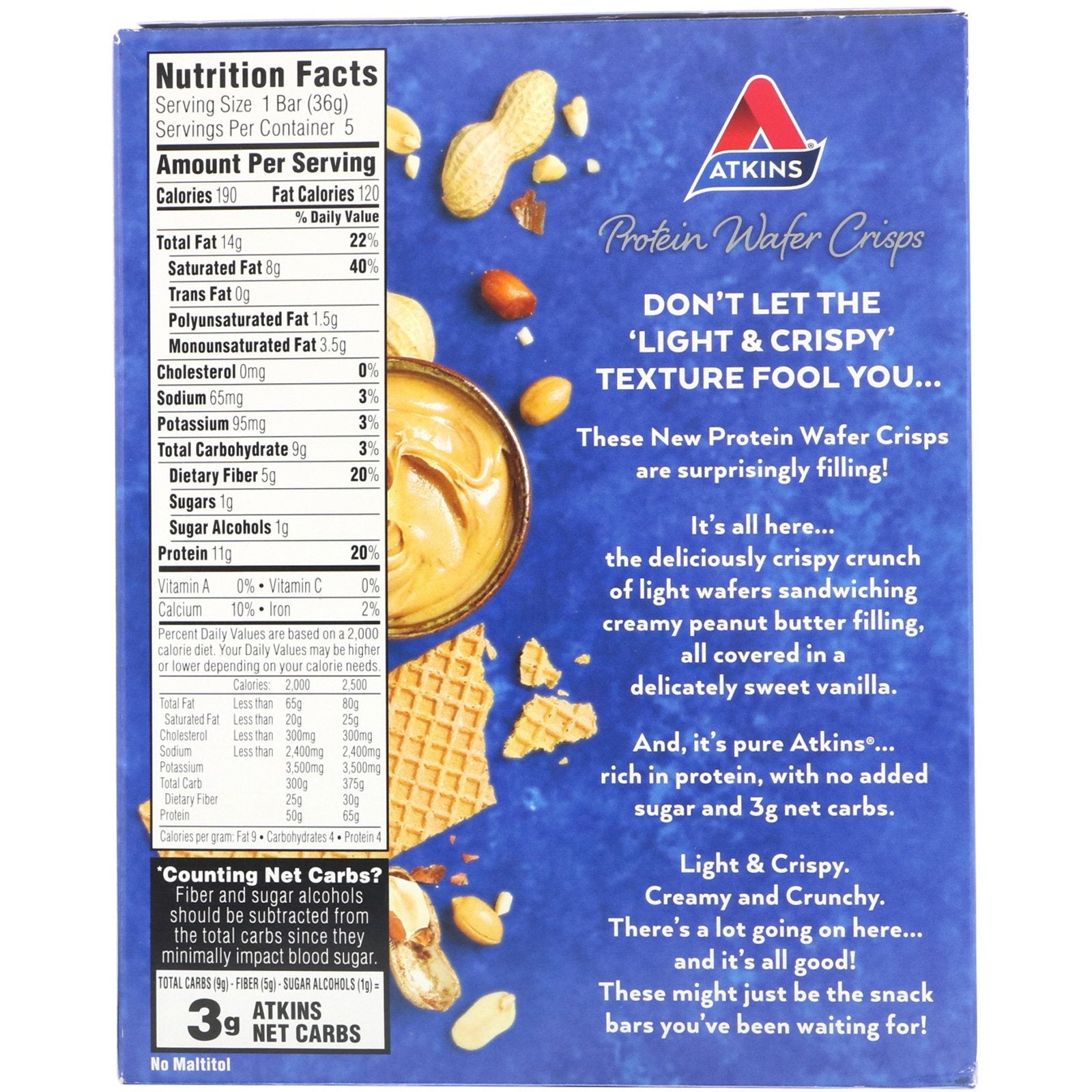 Snack Light & Crispy Texture Surprisingly Filling! No Artificial Colors, Flavors or Preservatives Naturally Flavored 11g Protein 3 g Net Carbs* 1 g Sugar 5 g Fiber No Maltitol *Counting Net Carbs? Fiber and sugar alcohols should be subtracted from the total carbs since they minimally impact blood sugar. Total carbs (9 g) - Fiber (5 g) - Sugar Alcohols (1 g) = 3 g Atkins Net Carbs Don't Let the 'Light & Crispy' Texture Fool You... These New Protein Wafer Crisps are surprisingly filling! It's all here... the deliciously crispy crunch of light wafers sandwiching creamy peanut butter filling, all covered in a delicately sweet vanilla. And, it's pure Atkins... rich in protein, with no added sugar and 3 g net carbs. Light & Crispy. Creamy and Crunchy. There's a lot going on here... and it's all good! These might just be the snack bars you've been waiting for! Atkins has all your weight loss needs covered with products for every occasion! Meal - Packed with protein and fiber to keep you satisfied. Snack - The perfect amount of protein and fiber for a between meal snack. Treat - Indulgent dessert without all the added sugar for a perfect after meal treat.