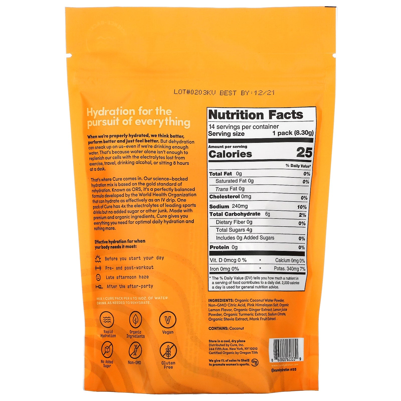 Science-Backed Hydration Balancing Electrolyte Mix Organic Coconut Water Pink Himalayan Salt No Added Sugar Rapid Hydration Organic Ingredients Vegan No Added Sugar Non-GMO Gluten Free Certified Organic by Oregon Tilth Hydration for the pursuit of everything When we're properly hydrated, we think better, perform better and just feel better. But dehydration can sneak up on us-even if we're drinking enough water. That's because water alone isn't enough to replenish our cells with the electrolytes lost from exercise, travel, drinking alcohol, or sitting 8 hours at a desk. That's where Cure comes in. Our science-backed hydration mix is based on the gold standard of rehydration. Known as ORS, it's a perfectly balanced formula developed by the World Health Organization that can hydrate as effectively as an IV drip. One pack of Cure has 4x the electrolytes of leading sports drinks but no added sugar or other junk. Made with premium and organic ingredients, Cure gives you everything you need for optimal daily hydration and nothing more.