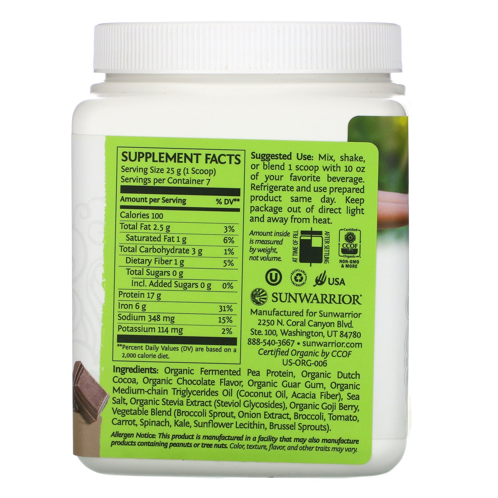 Organic fermented pea protein, organic dutch cocoa,organic chocolate flavor, organic guar gum, organic medium-chain triglycerides oil (coconut oil, acacia fiber), sea salt, organic stevia extract (steviol glycosides), organic goji berry, vegetable blend (broccoli sprout, onion extract, broccoli,tomato, carrot, spinach, kale, sunflower lecithin, brussel sprouts). Allergen notice: This product is manufactured in a facility that may also manufacture products containing peanuts or tree nuts.Supplement Facts
