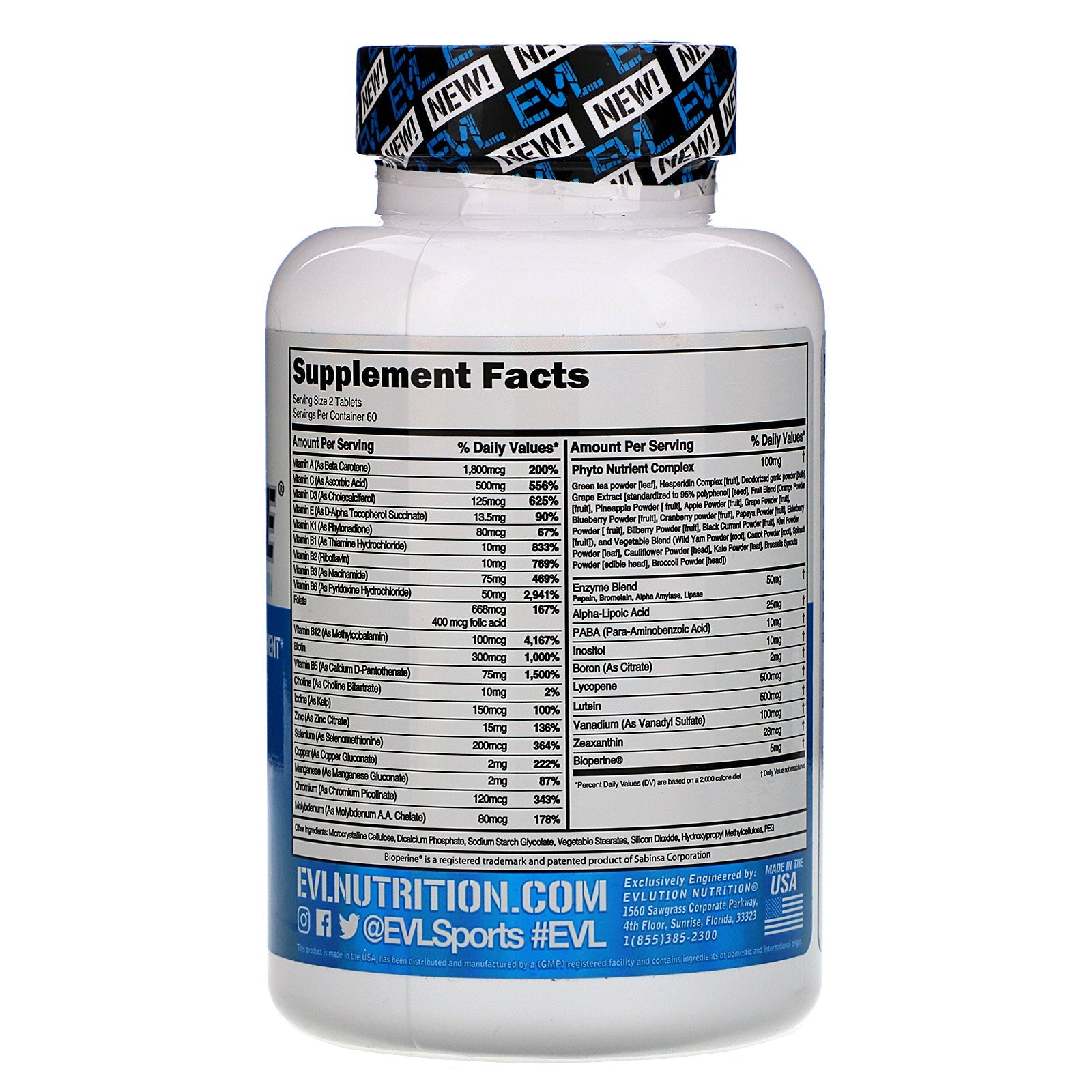 Serving Size: 2 Tablets Servings Per Container: 60 Amount Per Serving %Daily Values* Vitamin A (As Beta Carotene) 1800 mcg 200% Vitamin C (As Ascorbic Acid) 500 mg 556% Vitamin D3 (As Cholecalciferol) 125 mcg 625% Vitamin E (As D-Alpha Tocopherol Succinate) 13.5 mg 90% Vitamin K1 (As Phytonadione) 80 mcg 67% Vitamin B1 (As Thiamine Hydrochloride) 10 mg 833% Vitamin B2 (Riboflavin) 10 mg 769% Vitamin B3 (As Niacinamide) 75 mg 469% Vitamin B6 (as Pyridoxine Hydrochloride) 50 mg 2,941% Folate 668 mcg 400 mcg folic acid 167% Vitamin B12 (As Methylcobalamin) 100 mcg 4,167% Biotin 300 mcg 1,000% Vitamin B5 (As Calcium D-Pantothenate) 75 mg 1,500% Choline (as Choline Bitartrate) 10 mg 2% Iodine (As Kelp) 150 mcg 100% Zinc (As Zinc Citrate) 15 mg 136% Selenium (As Selenomethionine) 200 mcg 364% Copper (As Copper Gluconate) 2 mg 222% Manganese (As Manganese Gluconate) 2 mg 87% Chromium (As Chromium Picolinate) 120 mcg 343% Molybdenum (As Molybdenum A.A. Chelate) 80 mcg 178% Phyto Nutrient Complex Green Tea Powder [leaf], Hesperidin Complex [fruit], Deodorized Garlic Powder [bulb], Grape Extract [standardized to 95% polyphenol [Seed], Fruit Blend (Orange Powder [fruit], Pineapple Powder [fruit], Apple Powder [fruit], Grape Powder [fruit], Blueberry Powder [fruit], Cranberry Powder [fruit], Papaya Powder [fruit], Elderberry Powder [fruit], Bilberry Powder [fruit], Black Currant Powder [fruit], Kiwi Powder [fruit], and Vegetable Blend (Wild Yam Powder [root], Carrot Powder [root], Spinach Powder [leaf], Cauliflower Powder [head], Kale Powder [leaf], Brussels Sprouts Powder [edible head], Broccoli Powder [head]) 100 mg † Enzyme Blend Papain, Bromelain, Alpha Amylase, Lipase 50 mg † Alpha-Lipoic Acid 25 mg † PABA (Para-Aminobenzoic Acid) 10 mg † Inositol 10 mg † Boron (As Citrate) 2 mg † Lycopene 500 mcg † Lutein 500 mcg † Vanadium (As Vanadyl Sulfate) 100 mcg † Zeaxanthin 28 mcg † Bioperine® 5 mg † *Percent Daily Values (DV) are based on a 2,000 calorie diet. †Daily Value not established.Disclaimer