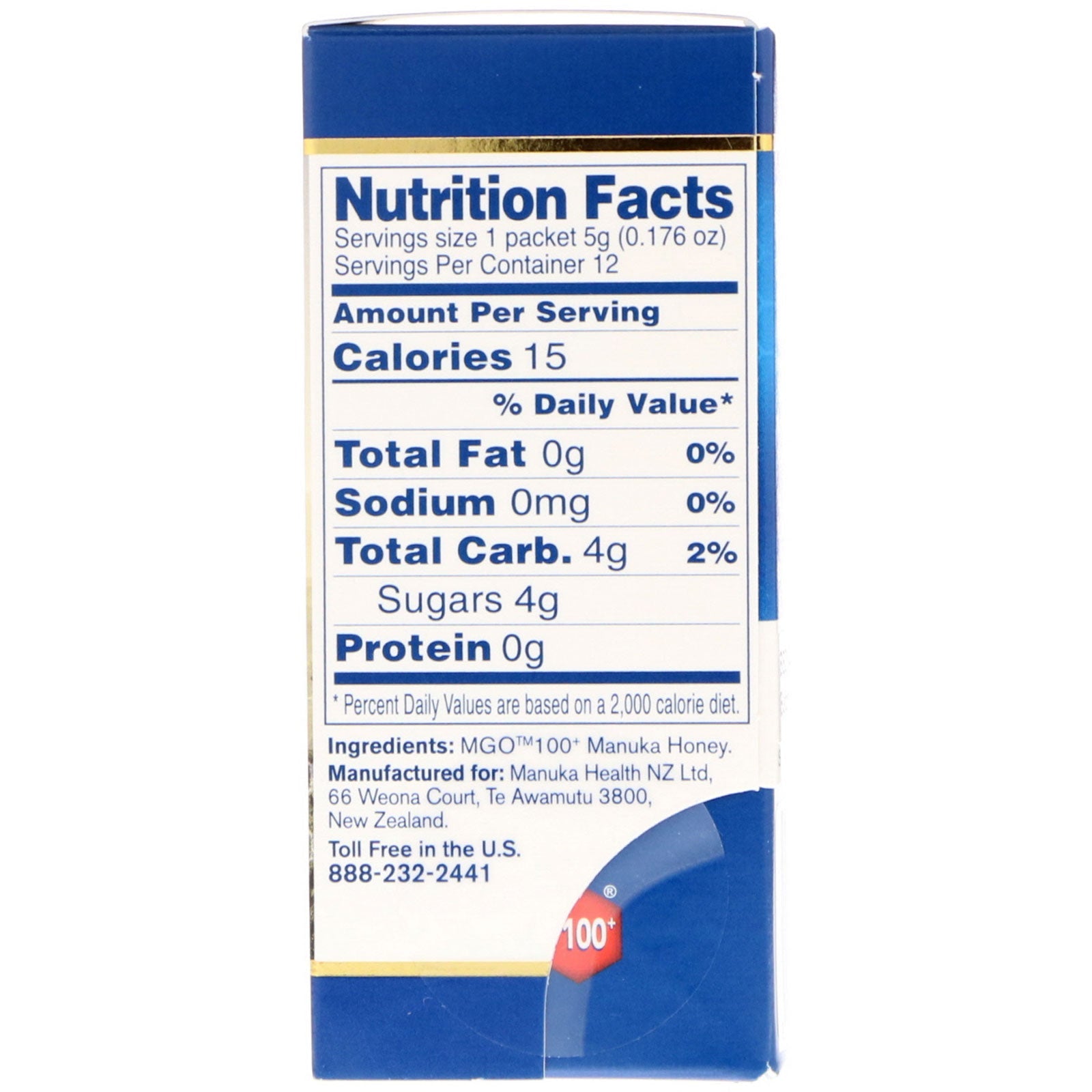 12 Sachets Snap & Squeeze Given by Nature, Proven by Science. Each box contains 12 individually servings of our MGO 100+ Manuka Honey -a convenient and mess-free way to get a boost of the natural goodness of Manuka honey on-the-go. Just blend the sachet in half, snap and squeeze. Every sachet of Manuka Health MGO 100+ Manuka Honey is: 100% New Zealand origin Tested for quality and purity Certified for natural methylglyoxal content (100 mg/kg) Nurtured and protected from beekeeper to you Perfect For: Lunchbox Traveling SportSugg. UseOther IngredientsMGO 100+ manuka honey.Supplement FactsServing Size: 1 packet 5 (0.176 oz) Serving Per Container: 12 Amount Per Serving %Daily Value* Calories 15 Total Fat 0 g 0% Sodium 0 mg 0% Total Carb. 4 g 2% Sugars 4 g Protein 0 g *Percent Daily Values are based on a 2,000 calorie diet.DisclaimerWhile VitaminsUK strives to ensure the accuracy of its product images...