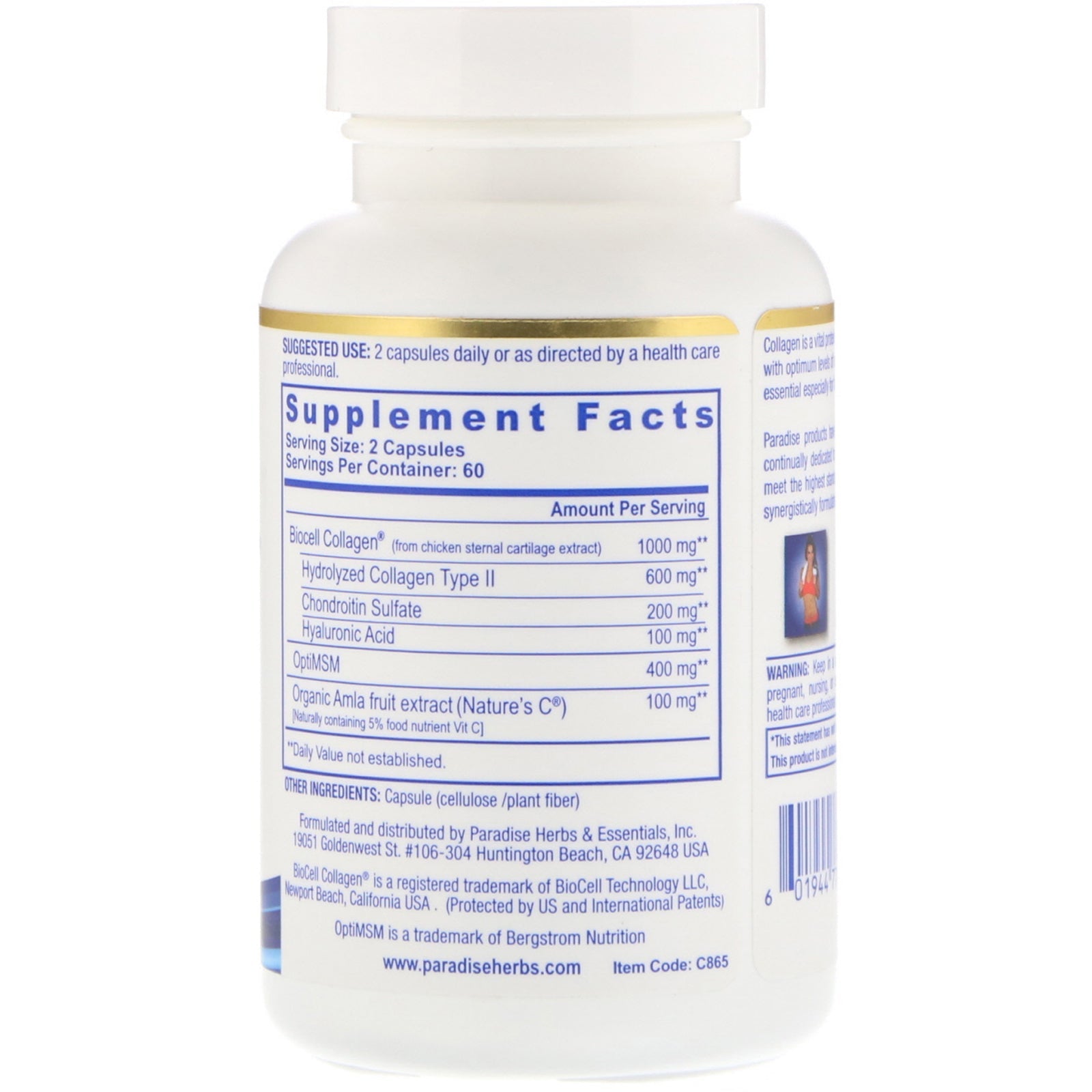 Serving Size: 2 Capsules Servings Per Container: 60 Amount per Serving % Daily Value** Biocell Collagen (from chicken sternal cartilage extract) 1000 mg ** Hydrolyzed Collagen Type II 600 mg ** Chondroitin Sulfate 200 mg ** Hyaluronic Acid 100 mg ** OptiMSM 400 mg ** Organic Amla fruit extract (Nature's C) (Naturally containing 5% food nutrient Vit C) 100 mg ** **Daily Value not established.