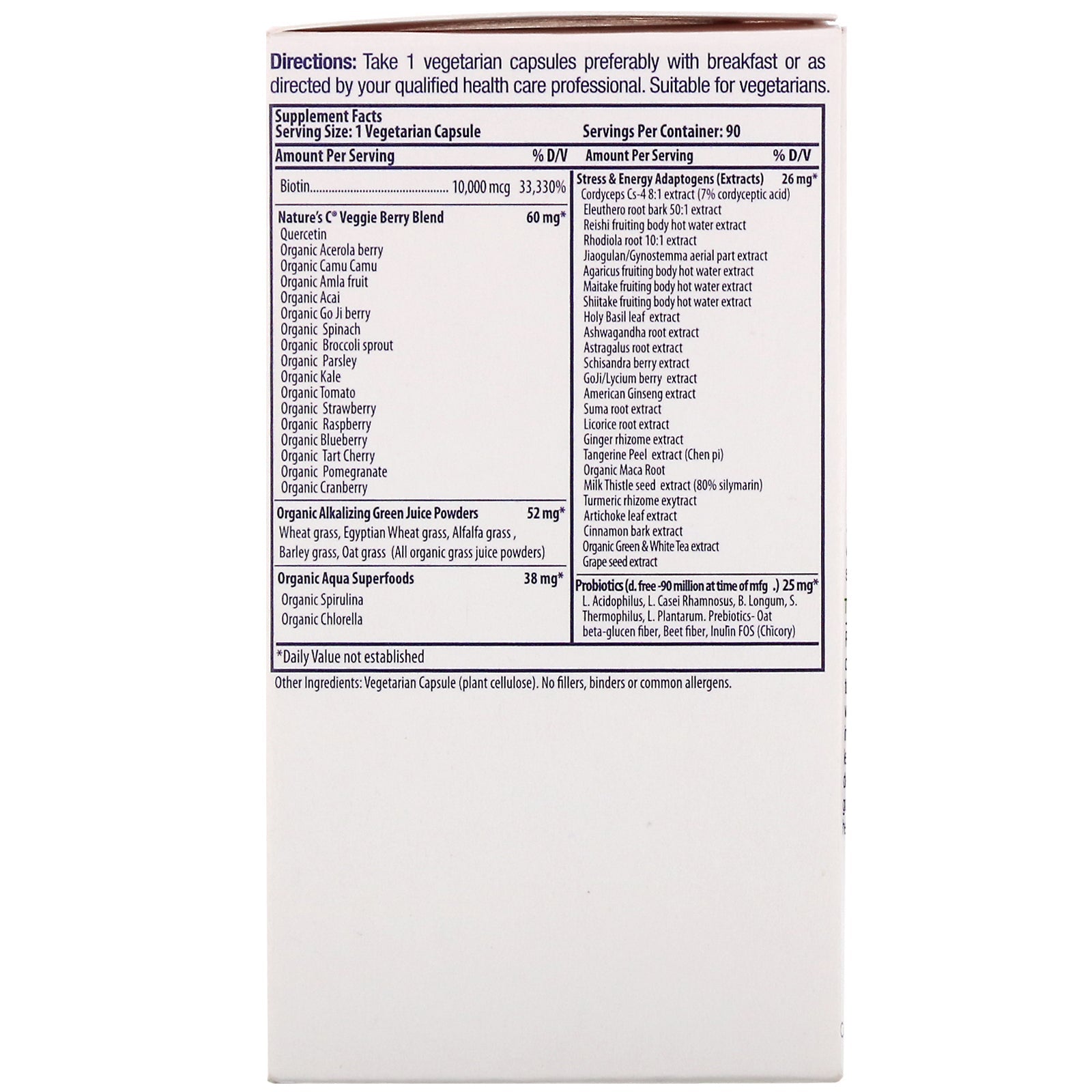 Serving Size: 1 Vegetarian Capsule Servings Per Container: 90 Amount Per Serving %D/V Biotin 10,000 mcg 33,330 % Nature's C® Veggie Berry Blend Quercetin Organic Acerola Berry Organic Camu Camu Organic Amla fruit Organic Acai Organic Go Ji berry Organic Spinach Organic Broccoli sprout Organic Parsley Organic Kale Organic Tomato Organic Strawberry Organic Raspberry Organic Blueberry Organic Tart Cherry Organic Pomegranate Organic Cranberry 60 mg * Organic Alkalizing Green Juice Powders Wheat grass, Egyptian Wheat grass, Alfalfa grass, Barley grass, Oat grass (All organic grass juice powders) 52 mg * Organic Aqua Superfoods Organic Spirulina Organic Chlorella 38 mg * Stress & Energy Adaptogens (Extracts) Cordyceps CS-4 8:1 extract (7% cordyceptic acid) Eleuthero root bark 50:1 extract Reishi fruiting body hot water extract Rhodiola root 10:1 extract Jiaogulan/Gynostemma aerial part extract Agaricus fruiting body hot water extract Maitake fruiting body hot water extract Shiitake fruiting body hot water extract Holy basil leaf extract Ashwagandha root Astragalus root extract Schisandra berry extract Goji/Lycium berry extract American Ginseng extract Suma root extract Licorice root extract Ginger rhizome extract Tangerine Peel extract (Chen pi) Organic Maca Root Milk Thistle seed extract (80% silymarin) Turmeric rhizome extract Artichoke leaf extract Cinnamon bark extract Organic Green & White Tea extract Grape seed extract 26 mg * Probiotics (d. free-90 million at time of mfg.) L. Acidophilus, L. Casei Rhamnosus, B. Longum, S. Thermophilus, L. Plantarum, Prebiotics-Oat beta-glucan fiber, Beet fiber, Inulin FOS (Chicory) 25 mg * *Daily Value not established.Disclaimer