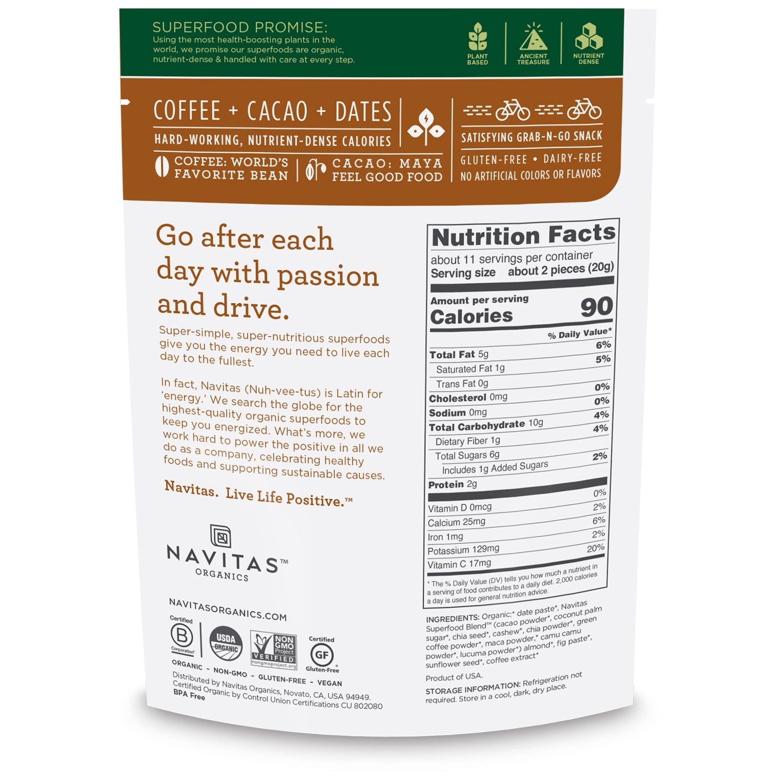 Premium - Plant Based Nutrient-Dense Essentials 90 Calories - Plant Protein - 20% DV Vitamin C - Per 20 g Serving Plant-Based Superfood Energizing Mocha Snack Coffee + Cacao + Dates Contains 8 Superfoods USDA Non GMO Project Verified Ancient Treasure Nutrient Dense Hard-Working, Nutrient-Dense Calories Coffee: World's Favorite Bean Cacao: Maya Feel Good Food Satisfying Grab-N-Go Snack Dairy Free No Artificial Colors or Flavors Certified B Corporation Certified Gluten Free Certified by Control Union Certifications BPA Free Live Life Positive Positive Mind - Positive Vibes - Positive Life Superfood Promise: Using the most health-boosting plants in the world, we promise our superfoods are , nutrient-dense & handled with care at every step. Go after each day with passion and drive. Super-simple, super-nutritious superfoods give you the energy you need to live each day to the fullest. In fact, Navitas (Nuh-vee-tus) is Latin for 'energy'. We search the globe for the highest-quality superfoods to keep you energized. What's more, we work hard to power the positive in all we do as a company, celebrating healthy foods and supporting sustainable causes. Navitas. Live Life Positive.