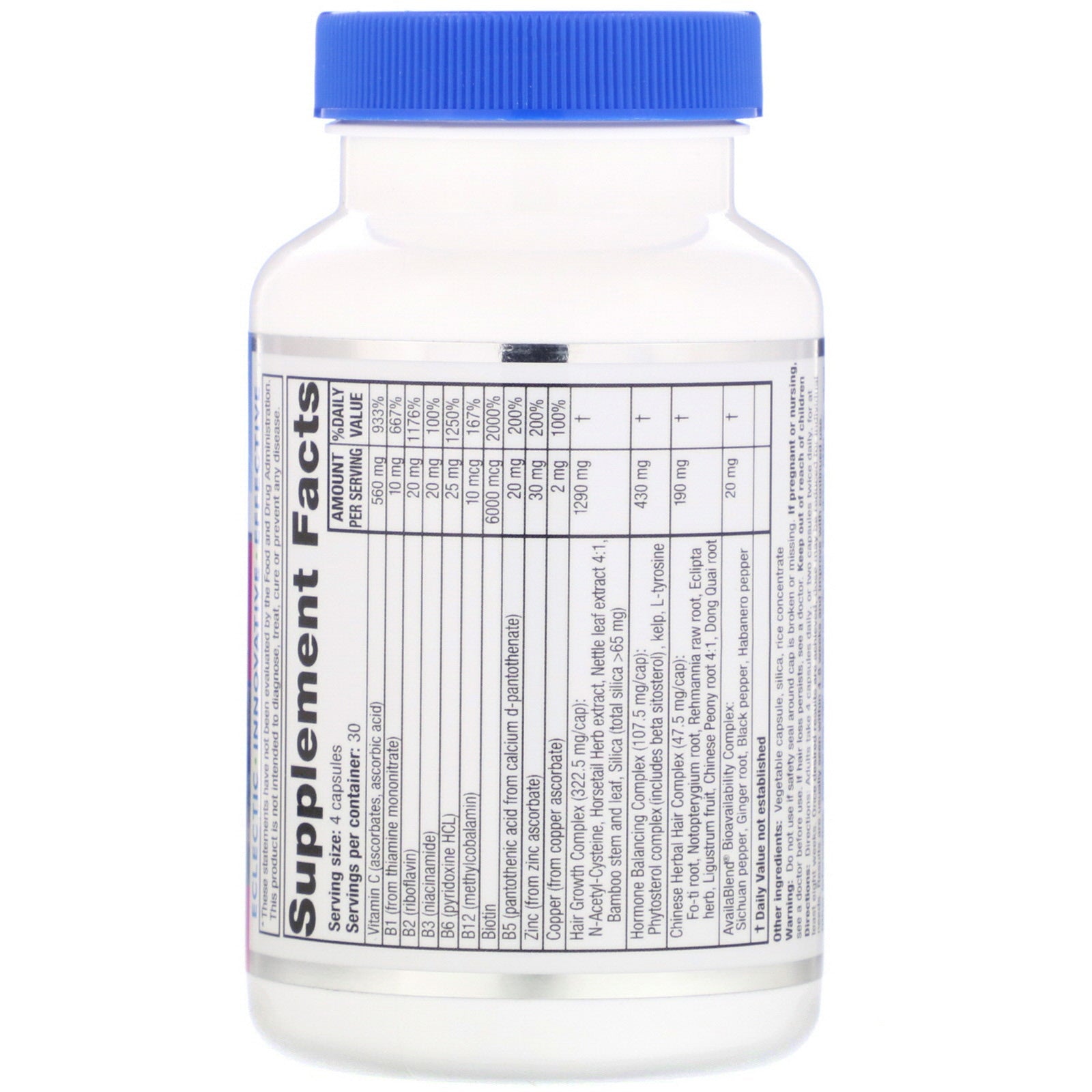 Women's Healthy Hair Support Promote Natural Growth Encourage Healthy, Full Hair Support Natural Recovery From Styling & Chemicals Herbal & Nutritional Supplement Eclectic - Innovative - Effective Guaranteed Results Naturally!Sugg. UseAdults take 4 capsules daily, or two capsules twice daily, for at least eight weeks. Once desired results are achieved, dose may be reduced for individual needs. Results are usually seen within 4-8 weeks and improve with continued use.Other IngredientsVegetable capsule, silica, rice concentrate. Other Information: Capsule size "00". Contains no nuts, corn, dairy, gluten, GMO, soy, wheat, or yeast.Supplement FactsServing Size: 4 capsules Servings Per Container: 30 Amount Per Serving %Daily Value Vitamin C (ascorbates, ascorbic acid) 560 mg 933% B1 (from thiamine mononitrate) 10 mg 667% B2 (riboflavin) 20 mg 1176% B3 (niacinamide) 20 mg 100% B6 (pyridoxine HCL) 25 mg 1250% B12 (methylcobalamin) 10 mcg 167% Biotin 6000 mcg 2000% B5 (pantothenic acid from calcium d-pantothenate) 20...