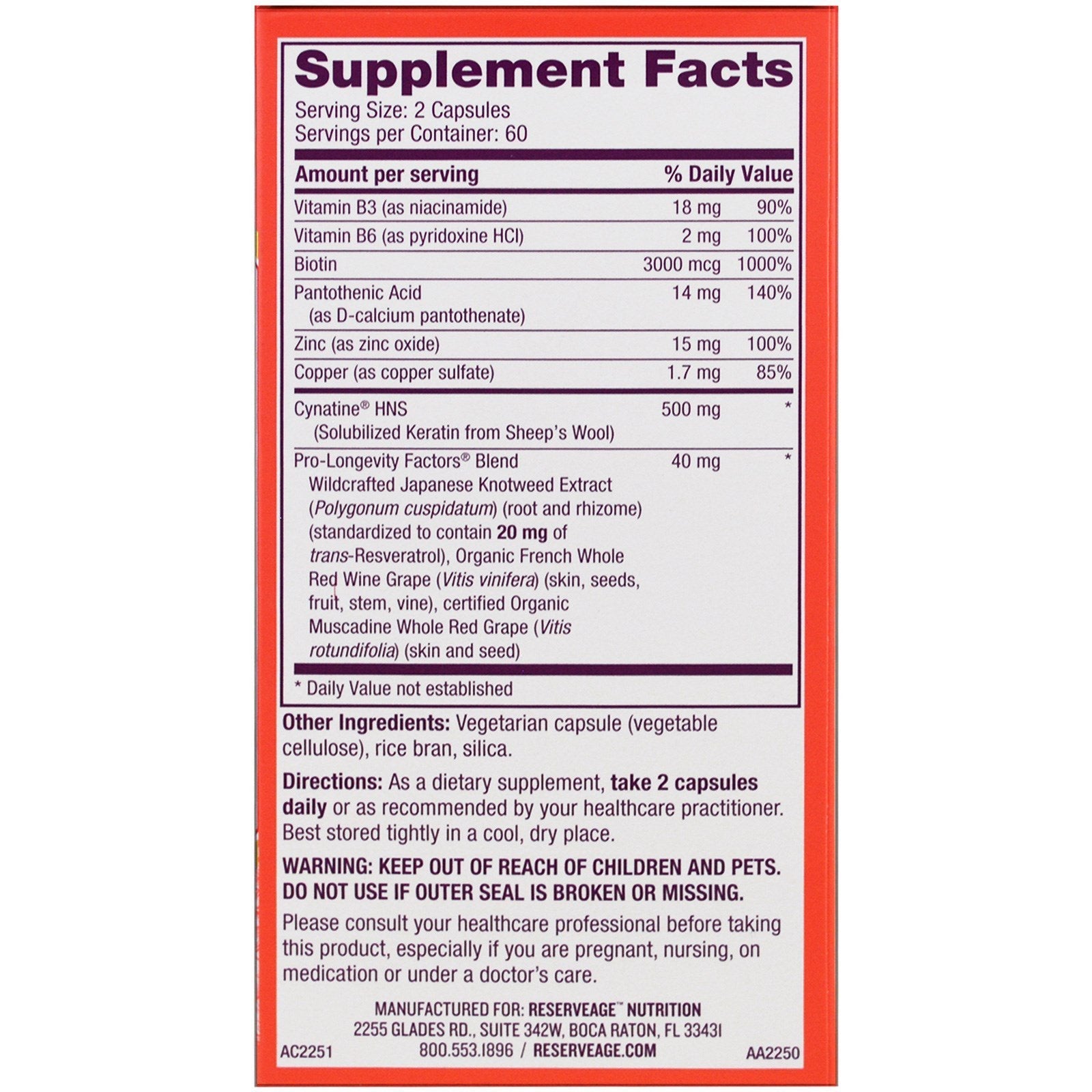 Serving Size: 2 Capsules Servings Per Container: 60 Amount Per Serving %Daily Value Vitamin B3 (as niacinamide) 18 mg 90% Vitamin B6 (as pyridoxine HCI) 2 g 100% Biotin 3000 mcg 1000% Pantothenic Acid (as D-calcium pantothenate) 14 mg 140% Zinc (as zinc oxide) 15 mg 100% Copper (as copper sulfate) 1.7 mg 85% Cynatine HNS (Solubilized Keratin from Sheep's Wool) 500 mg * Pro-Longevity Factors Blend Wildcrafted Japanese Knotweed Extract (Polygonum cuspidatum) (root and rhizome) (standardized to contains 20 mg of trans-Resveratrol), Organic French Whole Red Wine Grape (Vitis vinifera) (skin, seeds, fruit, stem, vine), certified Organic Muscadine Whole Red Grape (Vitis rotundifolia) (skin and seed) 40 mg * *Daily Value not establishedDisclaimer