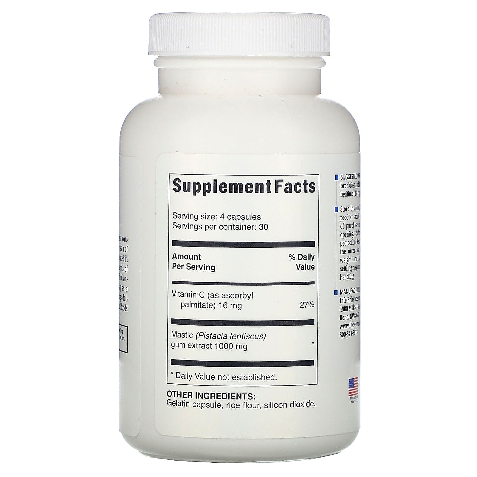 Gastrointestinal Support A Dietary Supplement Bye-Lori is a dietary supplement containing mastic gum, a natural resin of the Pistacia lentiscus tree, cultivated in the Mediterranean for thousands of years. Used traditionally as a food antioxidant, mastic is used today as a chewing gum base and flavoring additive in a wide range of traditional foods and drinks.Sugg. UseTake 4 capsules before breakfast and 4 capsules optionally at bedtime (4-8 capsules per day).Other IngredientsGelatin capsule, rice flour, silicon dioxide.Supplement FactsServing Size: 4 capsules Servings Per Container: 30 Amount Per Serving % Daily Value Vitamin C (as ascorbyl palmitate) 16 mg 27% Mastic (Pistacia lentiscus) gum extract 1000 mg * *Daily Value not established.DisclaimerWhile VitaminsUK strives to ensure the accuracy of its product images and information, some manufacturing changes to packaging and/or ingredients may be pending update on our site. Although items may occasionally ship with alternate packaging, freshness is always guaranteed. We...