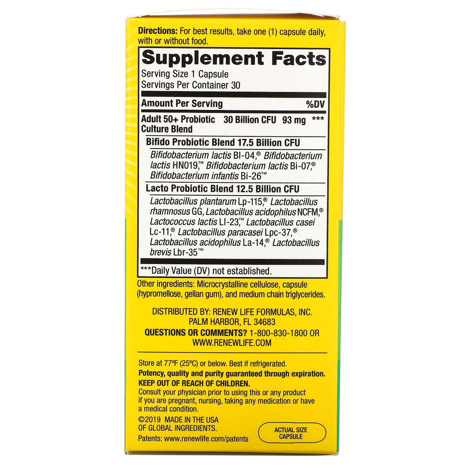 Serving Size: 1 Capsule Serving Per Container: 30 Amount Per Serving %Daily Value Adult 50+ Probiotic Culture Blend 30 Billion CFU 93 mg *** Bifido Probiotic Blend Bifidobacterium lactis B1-04®, Bifidobacterium lactis HNO19™, Bifidobacterium lactis Bi-07®, Bifidobacterium infantis Bi-26™ 17.5 Billion CFU Lacto Probiotic Blend Lactobacillus plantarum Lp-115®, Lactobacillus rhamnosus GG, Lactobacillus acidophilus NCFM®, Lactococcus lacis Li-23™, Lactobacillus casei Lc-11®, Lactobacillus paracasei Lpc-37®, Lactobacillus acidophilus La-14®, Lactobacillus brevis Lbr-35™ 12.5 Billion ***Daily Value (DV) not established.Disclaimer