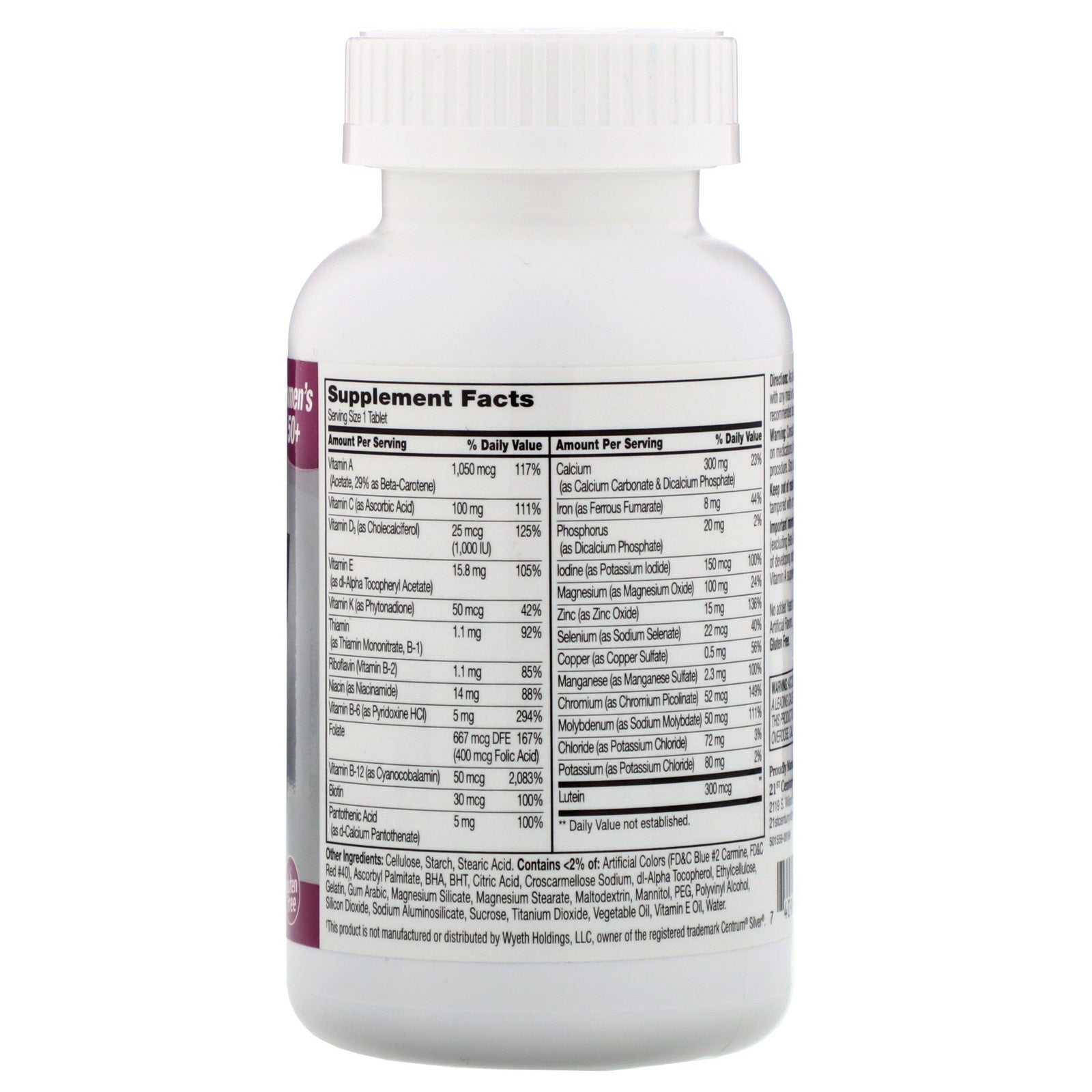 Serving Size: 1 Tablet Amount Per Serving % Daily Value Vitamin A (Acetate, 29% as Beta-Carotene) 1,050 mcg 117% Vitamin C (as Ascorbic Acid) 100 mg 111% Vitamin D3 (as Cholecalciferol) 25 mcg (1,000 IU) 125% Vitamin E (as dl-alpha Tocopheryl Acetate) 15.8 mg 105% Vitamin K (as Phytonadione) 50 mcg 42% Thiamin (as Thiamin Mononitrate, B1) 1.1 mg 92% Riboflavin (Vitamin B-2) 1.1 mg 85% Niacin (as Niacinamide) 14 mg 88% Vitamin B-6 (as Pyridoxine HCl) 5 mg 294% Folate 667 mcg DFE (400 mcg Folic Acid) 167% Vitamin B-12 (as Cyanocobalamin) 50 mcg 2,083% Biotin 30 mcg 100% Pantothenic Acid (as d-Calcium Pantothenate) 5 mg 100% Calcium (as Calcium Carbonate & Dicalcium Phosphate) 300 mg 23% Iron (as Ferrous Fumarate) 8 mg 44% Phosphorus (as Dicalcium Phosphate) 20 mg 2% Iodine (as Potassium Iodide) 150 mcg 100% Magnesium (as Magnesium Oxide) 100 mg 24% Zinc (as Zinc Oxide) 15 mg 136% Selenium (as Sodium Selenate) 22 mcg 40% Copper (as Copper Sulfate) 0.5 mg 56% Manganese (as Manganese Sulfate) 2.3 mg 100% Chromium (as Chromium Picolinate) 52 mcg 149% Molybdenum (as Sodium Molybdate) 50 mcg 111% Chloride (as Potassium Chloride) 72 mg 3% Potassium (as Potassium Chloride) 80 mg 2% Lutein 300 mcg ** **Daily Value not established.Disclaimer