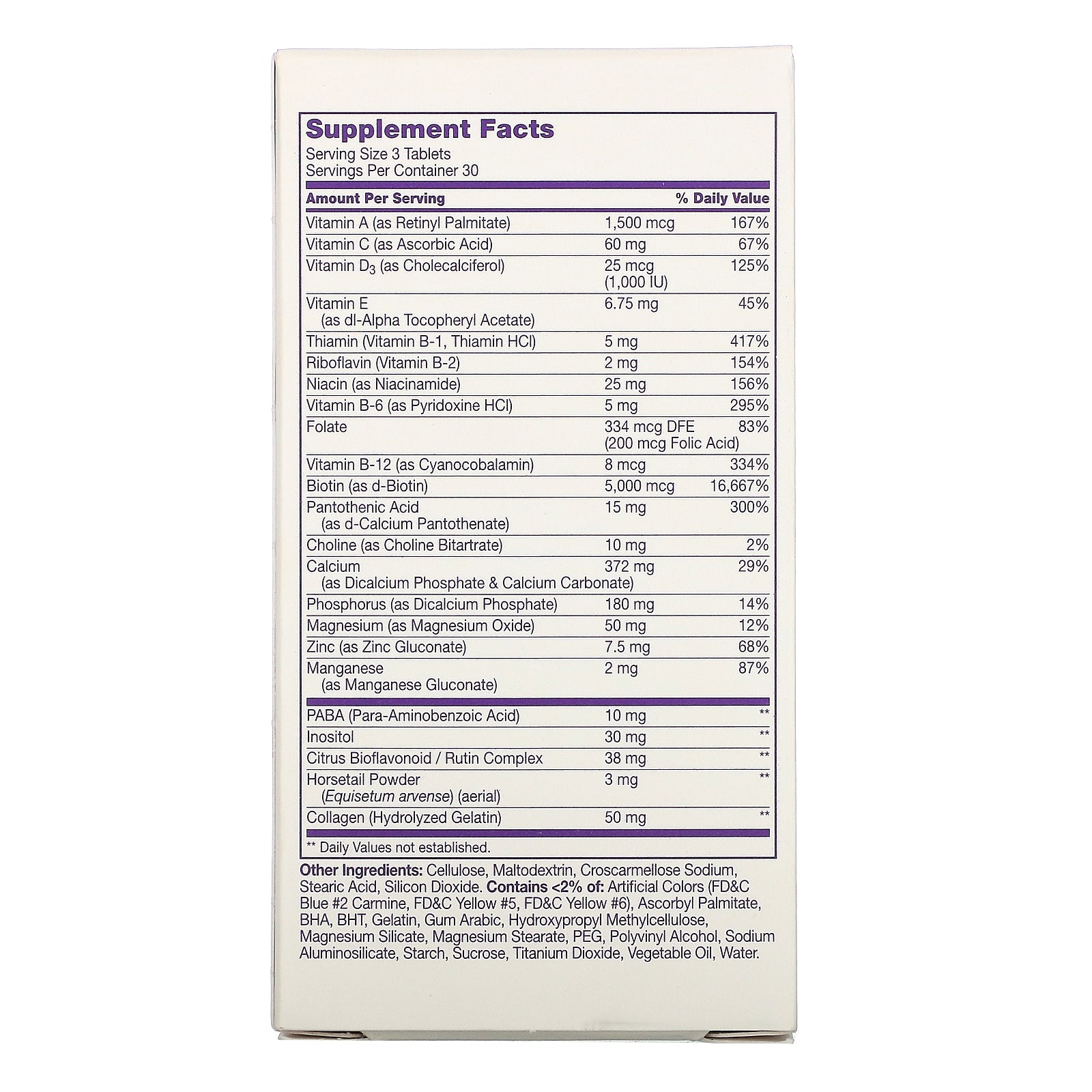 Serving Size: 3 Tablets Servings Per Container: 30 Amount per serving % Daily Value Vitamin A (as Retinyl Palmitate) 1,500 mcg 167% Vitamin C (as Ascorbic Acid) 60 mg 67% Vitamin D3 (as Cholecalciferol) 25 mcg (1,000 IU) 125% Vitamin E (as dl-Alpha Tocopheryl Acetate) 6.75 mg 45% Thiamin (as Vitamin B-1, Thiamin HCI) 5 mg 417% Riboflavin (Vitamin B-2) 2 mg 154% Niacin (as Niacinamide) 25 mg 156% Vitamin B-6 (as Pyridoxine HCI) 5 mg 295% Folate 334 mcg DFE (200 mcg Folic Acid) 83% Vitamin B-12 (as Cyanocobalamin) 8 mcg 334% Biotin (as d-Biotin) 5,000 mcg 16,667% Pantothenic Acid (as d-Calcium Pantothenate) 15 mg 300% Choline (as Choline Bitartrate) 10 mg 2% Calcium (as Dicalcium Phosphate & Calcium Carbonate) 372 mg 29% Phosphorus (as Dicalcium Phosphate) 180 mg 14% Magnesium (as Magnesium Oxide) 50 mg 12% Zinc (as Zinc Gluconate) 7.5 mg 68% Manganese (as Manganese Gluconate) 2 mg 87% PABA (Para-Aminobenzoic Acid) 10 mg ** Inositol 30 mg ** Citrus Bioflavonoid / Rutin Complex 38 mg ** Horsetail Powder (Equisetum arvense) (aerial) 3 mg ** Collagen (Hydrolyzed Gelatin) 50 mg ** **Daily Value (DV) not established.Disclaimer