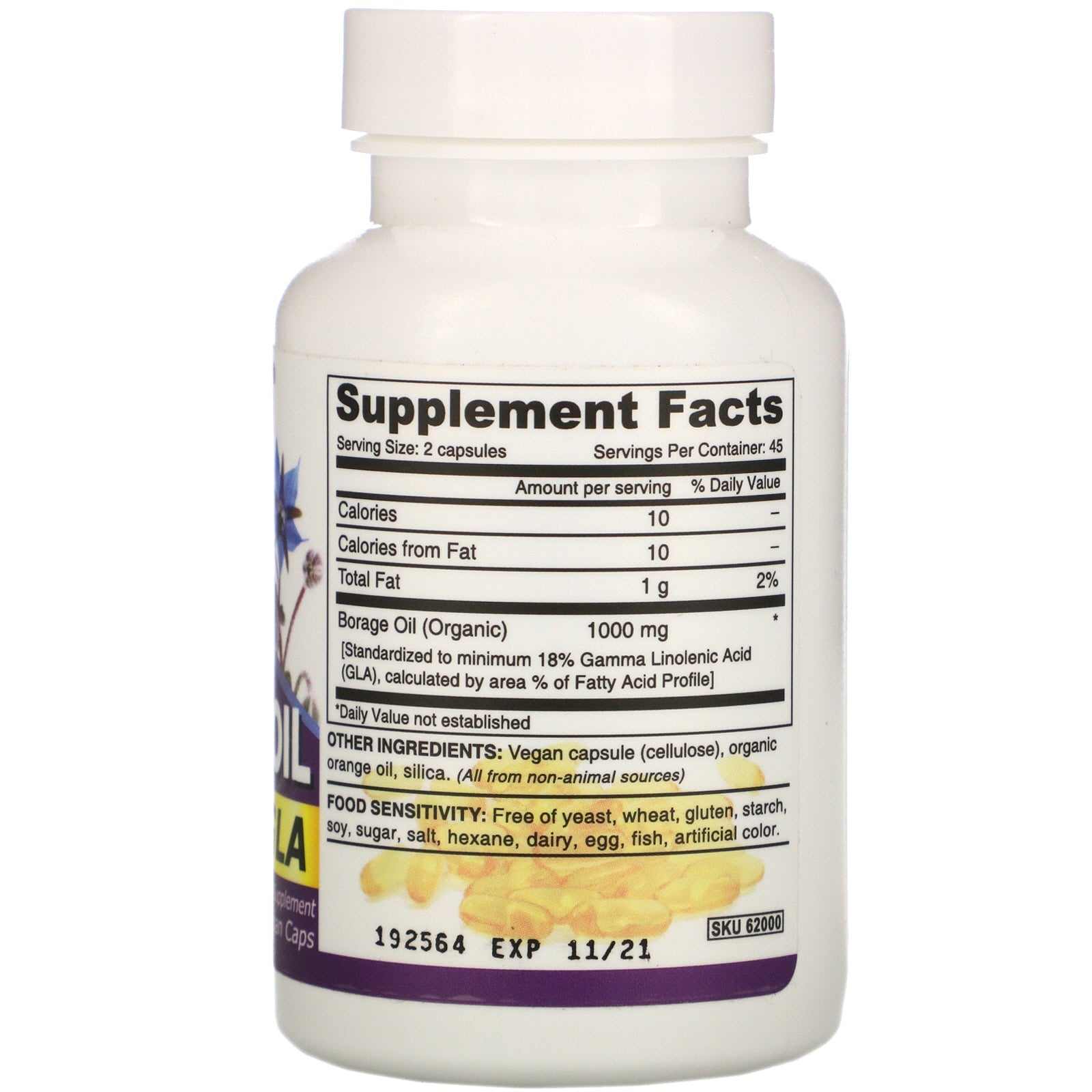 Dietary Supplement The Borage Oil used in this product is: Organic, Cold-pressed Vegan® - This product does not contain animal products, derivatives or byproducts. 100% Vegetarian, Vegan. This product is registered with the Vegan Society.Sugg. UseFor adults, take two (2) capsules daily with a meal or as directed by your health care provider.Other IngredientsVegan capsule (cellulose), organic orange oil, silica. (All from non-animal sources). Food Sensitivity: Free of yeast, wheat, gluten, starch, soy, sugar, salt, hexane, diary, egg, fish, artificial color.Supplement FactsServing Size: 2 capsules Servings Per Container: 45 Amount per Serving % Daily Value Calories 10 _ Calories from Fat 10 _ Total Fat 1 g 2% Borage Oil (Organic) (Standardized to minimum 18% Gamma Linolenic Acid (GLA), calculated by area % of Fatty Acid Profile) 1000 mg * *Daily Value not establishedDisclaimerWhile VitaminsUK strives to ensure the accuracy of its product images and information, some manufacturing changes to...