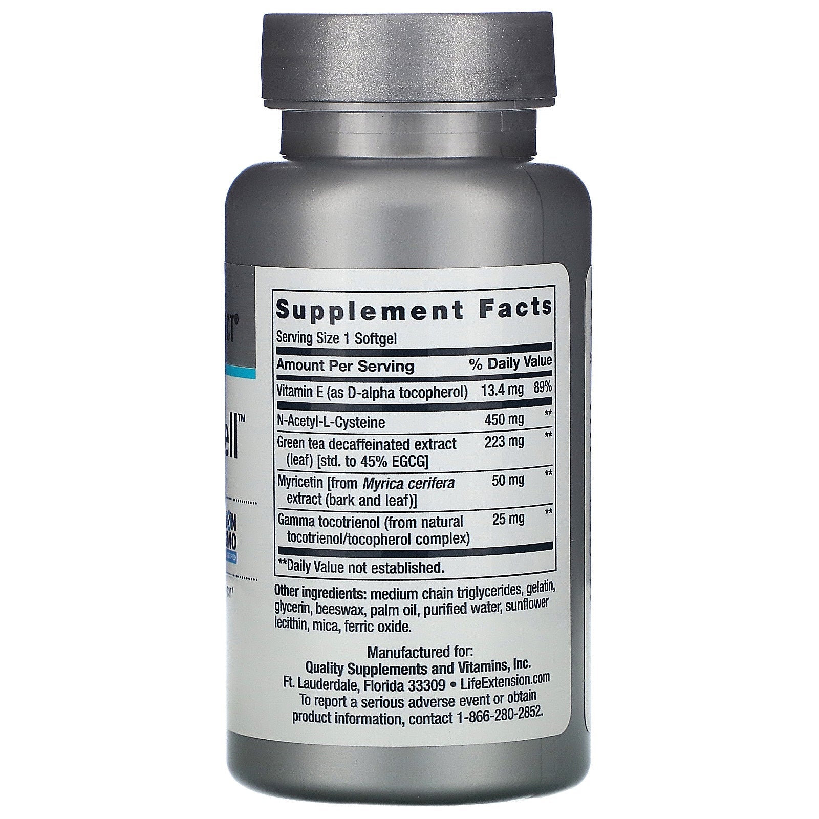 Serving Size: 1 Softgel Amount Per Serving % Daily Value Vitamin E (as D-alpha tocopherol) 13.4 mg 89% N-Acetyl-L-Cysteine 450 mg ** Green tea decaffeinated extract (leaf) [std. to 45% EGCG] 223 mg ** Myricetin [from Myrica cerifera extract (bark and leaf)] 50 mg ** Gamma tocotrienol (from natural tocotrienol/tocopherol complex) 25 mg ** **Daily Value not established.Disclaimer