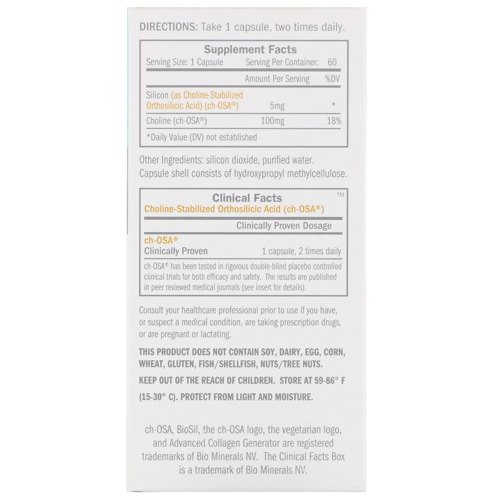 Serving Size: 1 Capsule Serving Per Container: 60 Amount Per Serving %Daily Value Silicon (as Choline-Stabilized Orthosilicic ) (ch-OSA®) 5 mg * Choline (ch--OSA®) 100 mg 18% *Daily Value (DV) not established. Clinical Facts Choline-Stabilized Orthosilicic Acid (ch-OSA®) Clinical Proven Dosage ch-OSA® Clinically Proven 1 capsule, 2 times daily ch-OSA® has been tested in rigorous double-blind placebo controlled clinical trials for both efficacy and safety. The results are published in peer reviewed medical journals.Disclaimer