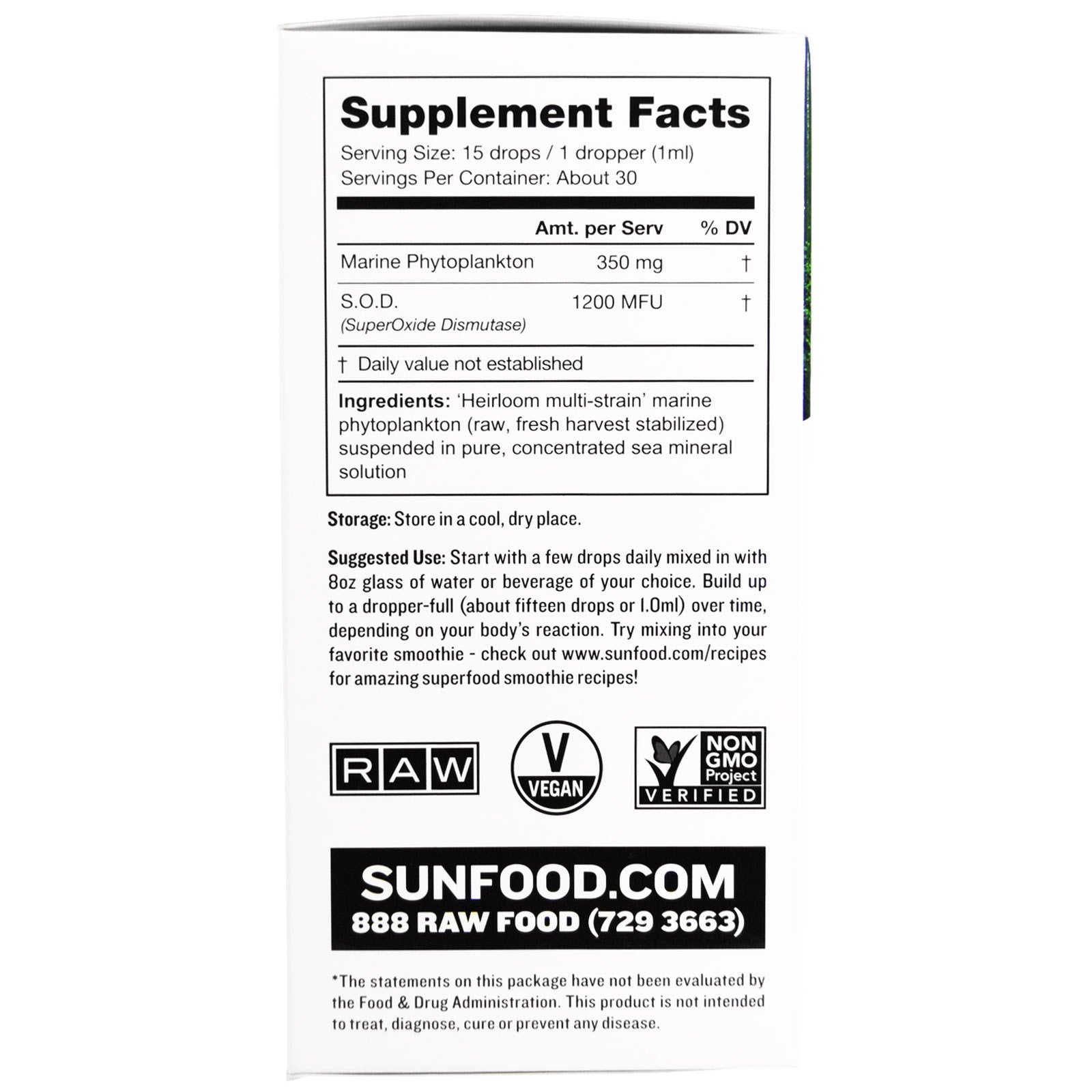 Serving Size: 15 drops / 1 dropper (1 ml) Serving Per Container: About 30 Amount Per Serving: % DV Marine Phytoplankton 350 mg † S.O.D. (SuperOxide Dismutase) 1200 MFU † † Daily Value not established.Disclaimer