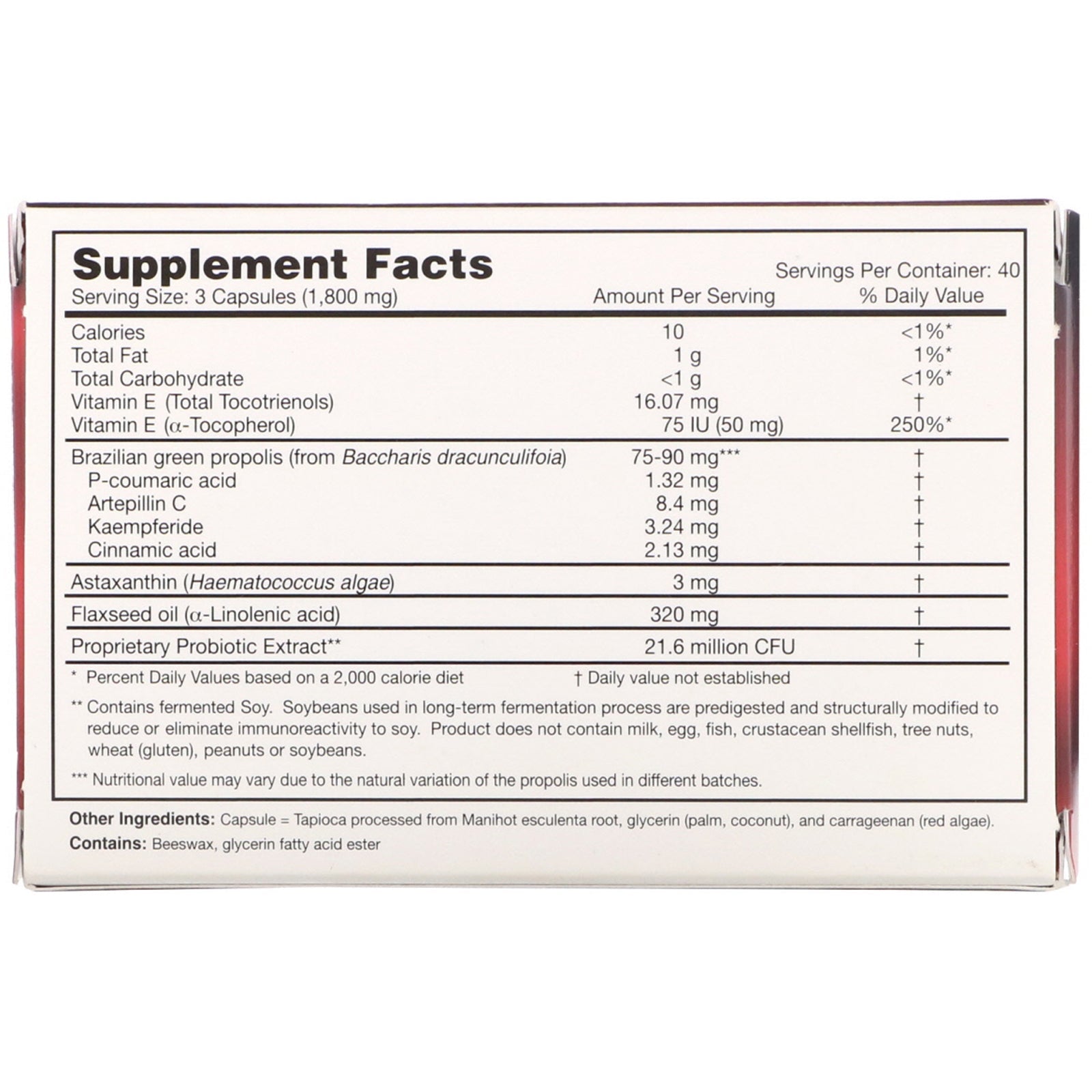 Serving Size: 3 Capsules (1,800 mg) Serving Per Container: 40 Amount Per Serving %Daily Value Calories 10 <1%* Total Fat 1 g 1%* Total Carbohydrate <1 g <1%* Vitamin E (Total Tocotrienols) 16.07 mg † Vitamin E (α-Tocopherol) 75 IU (50 mg) 250%* Brazilian green propolis (from Baccharis dracunculifoia) P-coumaric acid Artepillin C Kaempferide Cinnamic acid 75-90 mg*** 1.32 mg 8.4 mg 3.24 mg 2.13 mg † † † † † Astaxanthin (Haematococcus algae) 3 mg † Flaxseed oil (α-Linoleic acid) 320 mg † Proprietary Probiotic Extract** 21.6 million CFU † *Percent Daily Values are based on a 2,000 calorie diet. †Daily value not established **Contains fermented Soy. Soybeans used in long-term fermentation process are predigested and structurally modified to reduce or eliminate immunoreactivity to soy. ***Nutritional value may vary due to the natural variation of the propolis used in different batches.Disclaimer