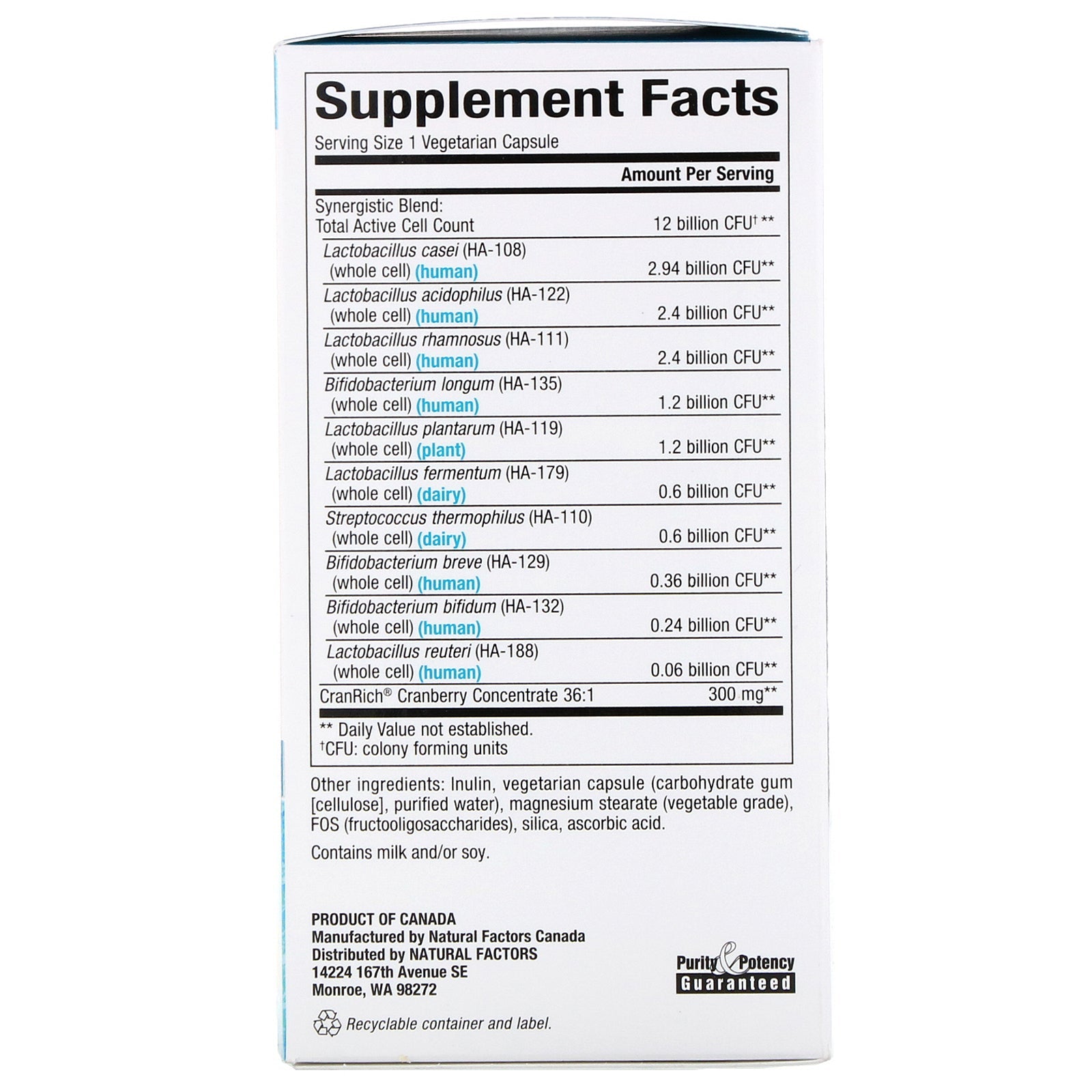 Serving Size: 1 Vegetarian Capsule Amount Per Serving %DV Synergistic Blend: Total Active Cell Count 12 billion CFU† ** Lactobacillus casei (HA-108) (whole cell) (human) 2.94 billion CFU ** Lactobacillus acidophilus (HA-122) (whole cell) (human) 2.4 billion CFU ** Lactobacillus rhamnosus (HA-111) (whole cell) (human) 2.4 billion CFU ** Bifidobacterium longum (HA-135) (whole cell) (human) 1.2 billion CFU ** Lactobacillus plantarum (HA-119) (whole cell) (plant) 1.2 billion CFU ** Lactobacillus fermentum (HA-179) (whole cell) (dairy) 0.6 billion CFU ** Streptococcus thermophillus (HA-110) (whole cell) (dairy) 0.6 billion CFU ** Bifidobacterium breve (HA-129) (whole cell) (human) 0.36 billion CFU ** Bifidobacterium bifidum (HA-132) (whole cell) (human) 0.24 billion CFU ** Lactobacillus reuteri (HA-188) (whole cell) (human) 0.06 billion CFU ** CranRich Cranberry Concentrate 36:1 300 mg ** **Daily Value not established. †CFU: colony forming unitsDisclaimer