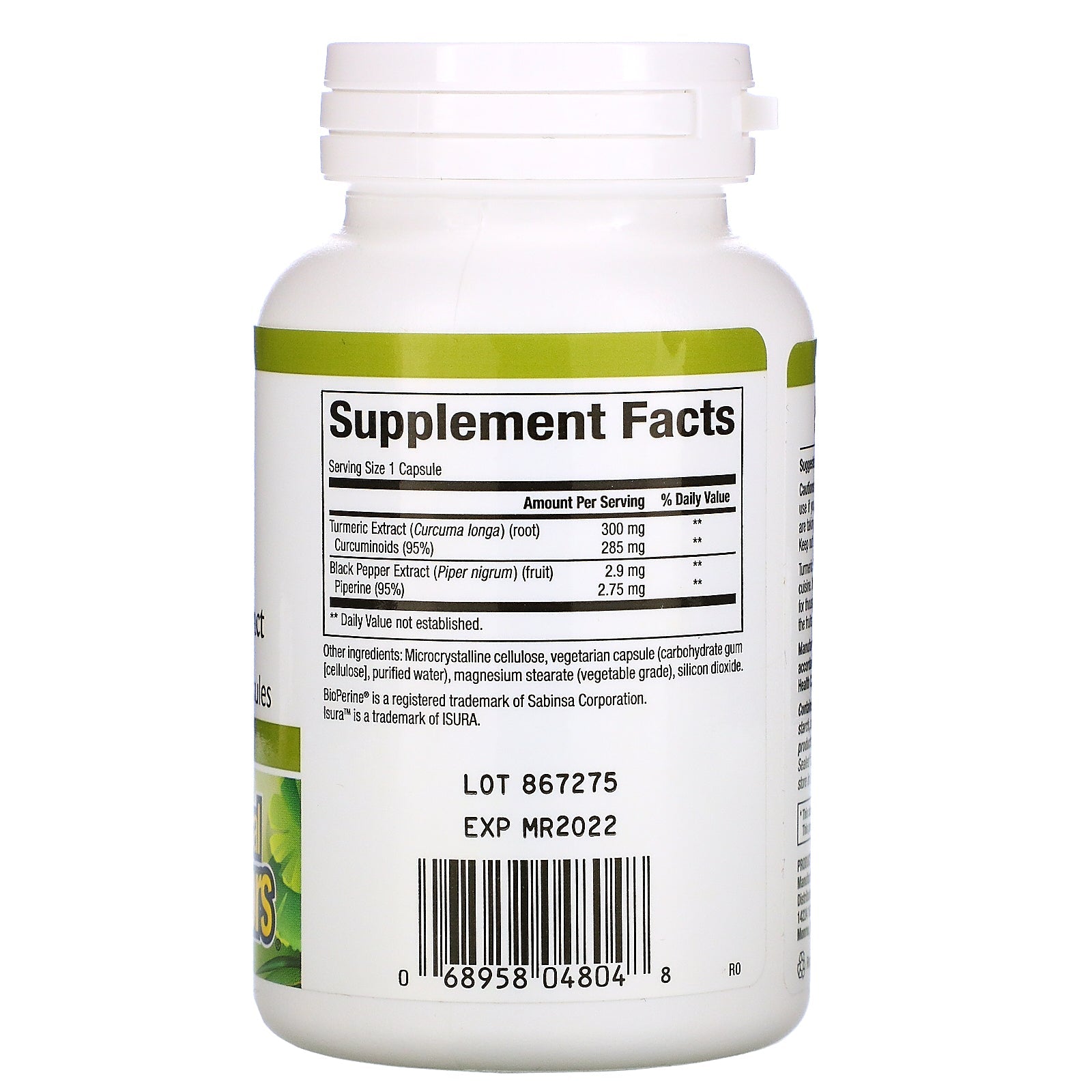 Dietary Supplement Antioxidant Support Suitable for Vegetarians/Vegans Turmeric is commonly used as a coloring and flavoring agent in South Asian cuisine. It has also been recommended by traditional Ayurvedic herbalists for thousands of years. BioPerine® is a pure form of piperine, derived from the fruits of black pepper. Isura: Non-GMO: Documentation ✔ Mass Spec: Lab Tested ✔Sugg. Use1 capsule per day or as directed by a health professional.Other IngredientsMicrocrystalline cellulose, vegetarian capsule (carbohydrate gum [cellulose], purified water), magnesium stearate (vegetable grade), silicon dioxide. Contains no artificial colors, preservatives, or sweeteners; no dairy, starch, sugar, wheat, gluten, yeast, soy, corn, egg, fish, shellfish, animal products, salt, tree nuts, or GMOs. Manufactured by Natural Factors to ensure safety and potency in accordance with Good Manufacturing Practices (GMP) of the FDA and Health Canada.Supplement FactsServing Size: 1 Capsule Amount Per Serving %Daily Value Turmeric Extract (Curcuma longa) (root) Curcuminoids (95%) 300 mg 285...