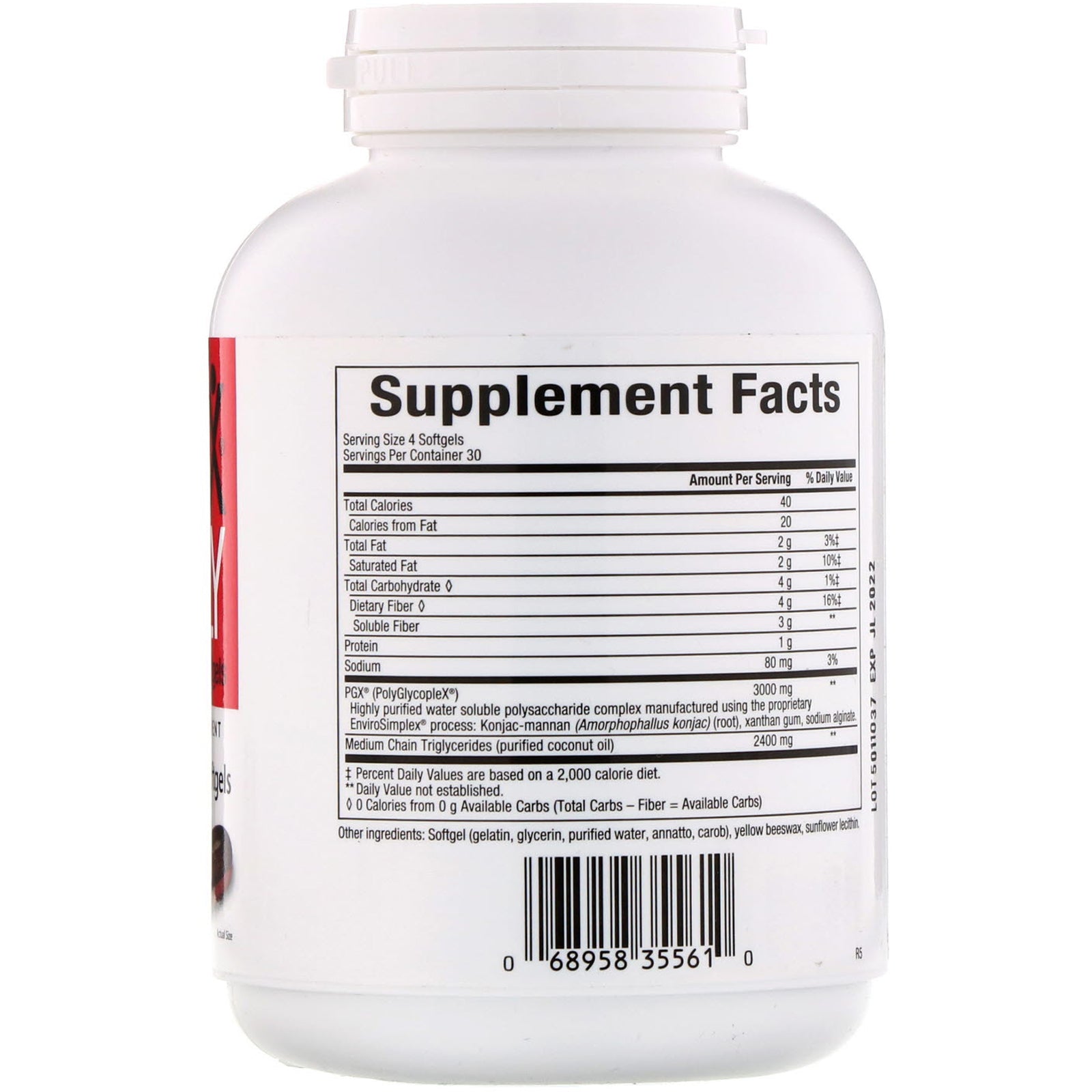 Dietary Supplement Purity & Potency Guaranteed Reduces appetite by promoting a feeling of fullness. Helps lower the glycemic index. Helps maintain healthy blood sugar and total cholesterol levels already within the normal range. Isura: Non-GMO: Documentation ✔ Mass Spec: Lab Tested ✔Sugg. UsePGX Daily softgels can be taken with or without food with a glass of water (8-16 oz. or 1-2 cups) or as directed by a health professional. Week 1: 1 softgel, 3 times daily. Week 2: 2-3 softgels, 3 times daily. Week 3 and beyond: 4 softgels, 3 times daily.Other IngredientsSoftgel (gelatin, glycerin, purified water, annatto, carob), yellow beeswax, sunflower lecithin. Contains no artificial colors, preservatives or sweeteners; no dairy, starch, sugar, wheat, gluten, yeast, soy, corn, egg, fish, shellfish, or GMOs. Manufactured by Natural Factors to ensure safety and potency in accordance with Good Manufacturing Practices (GMP) of the FDA and Health Canada.Supplement FactsServing Size: 4 Softgels...