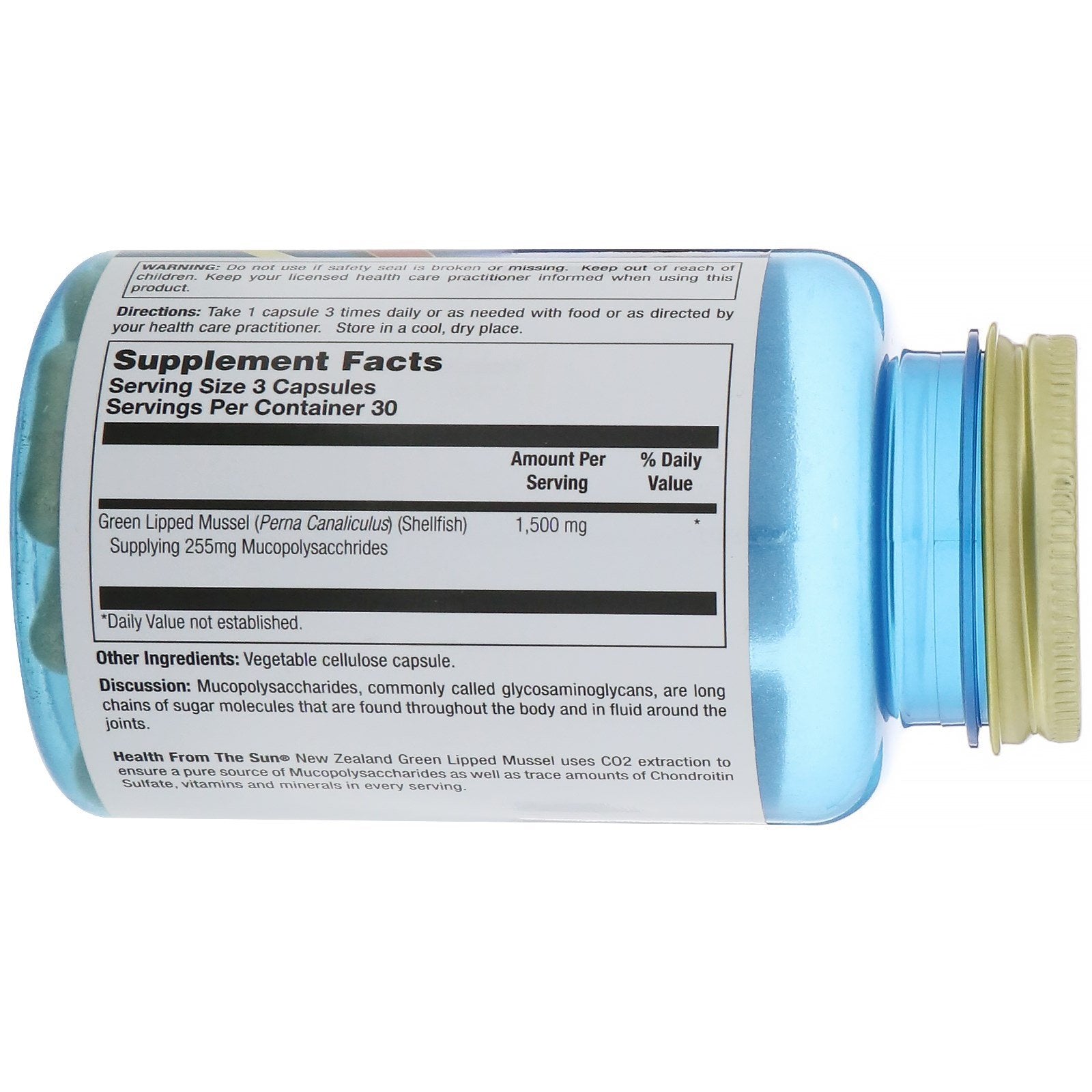 Guaranteed Pure CO2 Supercritical Extraction Joint Support Dietary Supplement Discussion: Mucopolysaccharides, commonly called glycosaminoglycans, are long chains of sugar molecules that are found throughout the body and in fluid around the joints. Health From The Sun New Zealand Green Lipped Mussel uses CO2 extraction to ensure a pure source of Mucopolysaccharides as well as trace amounts of Chondroitin Sulfate, vitamins and minerals in every serving.Sugg. UseTake 1 capsule 3 times daily or as needed with food or as directed by your health care practitioner.Other IngredientsVegetable cellulose capsule.Supplement FactsServing Size: 3 Capsules Servings Per Container: 30 Amount Per Serving % Daily Value Green Lipped Mussel (Perna Canaliculus) (Shellfish) Supplying 255 mg Mucopolysacchrides 1,500 mg * *Daily Value not established.DisclaimerWhile VitaminsUK strives to ensure the accuracy of its product images and information, some manufacturing changes to packaging and/or ingredients may be pending update on our site. Although items may occasionally ship with...