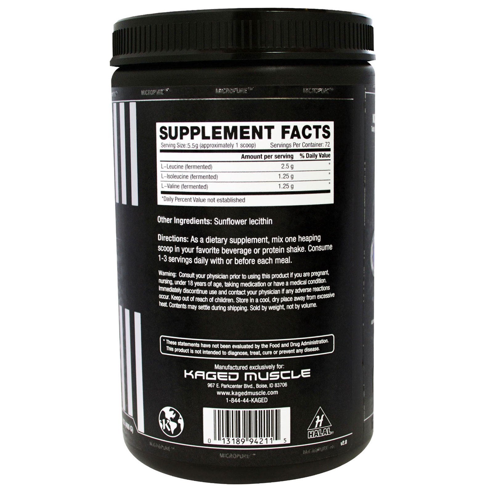 Fermaceutical Grade Micropure - Quality Guarantee Banned Substance Free Dietary Supplement Kosher Halal Not All BCAAs are Created Equal Today, there are many choices available for BCAAs, but if you want to fuel your body with the best, these is only one choice - Micropure BCAA Microencapsulated/Mixes Clear Why Kaged Muscle? No Soy or Inulin Gluten Free Non-GMO Vegetable Fermentation Rapid Absorption BSE/TSE Free Micropure Quality Guarantee - Each product is third party tested for purity and potency.Sugg. UseAs a dietary supplement, mix one heaping scoop in your favorite beverage or protein shake. Consume 1-3 servings daily with or before each meal.Other IngredientsSunflower lecithin.Supplement FactsServing Size: 5.5 g (approximately 1 scoop) Serving Per Container: 72 Amount Per Serving % Daily Value L-Leucine (fermented) 2.5 g * L-Isoleucine (fermented) 1.25 g * L-Valine (fermented) 1.25 g * *Daily Value not established.DisclaimerWhile VitaminsUK strives to ensure the accuracy of its product images...