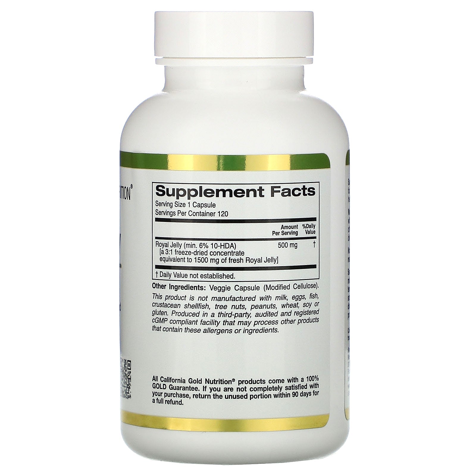 California Gold Nutrition Royal Jelly Concentrated & Freeze Dried 1500 mg Equivalency of Fresh Royal Jelly Minimum of 6% 10-HDA Helps Support Vitality* Formulated to Contain: No Gluten, No GMOs, No Soy Produced in a 3rd Party Audited cGMP Registered (Certified) Facility 100% Gold Guarantee A natural source of many nutrients, Royal Jelly is the only food for the Queen Bee. It is a milky secretion produced by worker honey bees. Research suggests that the bioactive substance within Royal Jelly called 10-HDA helps to support overall health and vitality.* California Gold Nutrition Royal Jelly contains the equivalency of 1500 mg of Fresh Royal Jelly with a minimum of 6% of 10-HDA. iTested Verified iHerb Blog: 3 Bee Products and Their BenefitsSugg. UseTake 1 capsule 1-2 times daily, or as directed by a healthcare professional.Other IngredientsMain Ingredients Royal Jelly (min. 6% 10-HDA) [a 3:1 freeze-dried concentrate equivalent to 1500 mg of...