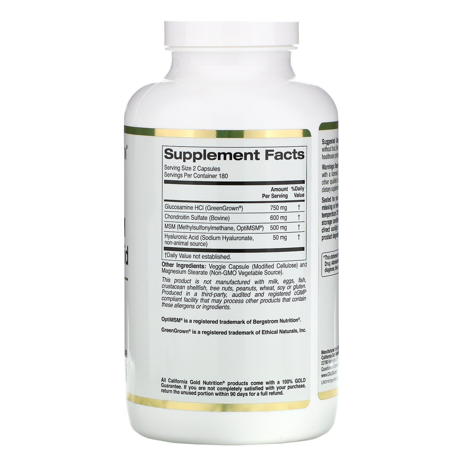 California Gold Nutrition® Glucosamine, Chondroitin, MSM Plus Hyaluronic Acid GreenGrown® Vegetarian Glucosamine OptiMSM® Methylsulfonylmethane Bovine Sourced Chondroitin Non-Animal Source Hyaluronic Acid Supports Healthy Joints* Produced in a 3rd Party Audited cGMP Registered (Certified) Facility Formulated to Contain: No Gluten, No GMOs, No Soy, No Shellfish 100% Gold Guarantee California Gold Nutrition ® Glucosamine, Chondroitin, MSM plus Hyaluronic Acid features patented GreenGrown ® Vegetarian Glucosamine and OptiMSM ® Methylsulfonylmethane plus bovine sourced Chondroitin and non-animal sourced Hyaluronic Acid. This formula contains no shellfish and is focused to support healthy, flexible joints.* Glucosamine is valued as a key ingredient in joint care formulas. GreenGrown ® is a 100% vegan source glucosamine that meets USP specifications and is protected by US and EU patents. In today’s huge joint-care market GreenGrown ® is the leading vegetable source glucosamine. Chondroitin Sulfate is a glycosaminoglycan (GAG) naturally present in many body tissues, and is an especially important component of joint cartilage and synovial tissue. Chondroitin promotes water retention within the joint, giving it resiliency by acting as a lubricant and a means to absorb shock. This nutrient thus helps to support the maintenance of healthy, flexible joint tissue and promotes proper joint mobility and comfort. MSM (methylsulfonylmethane), also known as dimethyl sulfone (DMSO2) and methyl sulfone, is an organic sulfur-containing compound that is essential for optimal health. Without sufficient MSM sulfur, your body cannot maintain an appropriate level of homeostasis. OptiMSM ® has earned the reputation for the purest, safest, and most consistent MSM in the world. Hyaluronic Acid is a compound present in every tissue of the body, with the highest concentrations occurring in connective tissues such as skin and cartilage. Hyaluronic Acid is an important constituent of joint fluid, where it serves as a lubricant and plays a role in resisting compressive forces. iHerb Blog: Natural Joint Health Support Save Your Joints iTested Verified Coming Soon