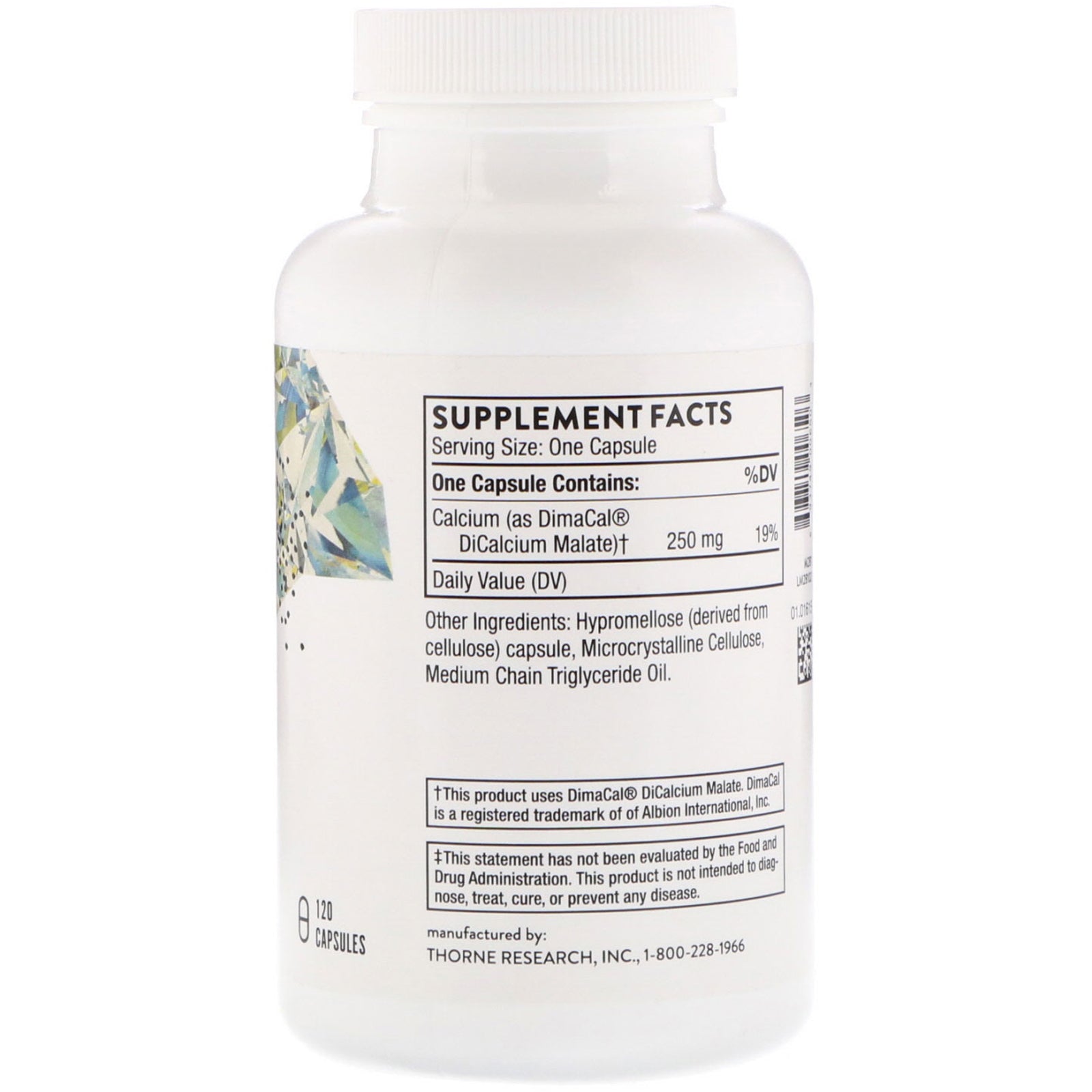 Dietary Supplement Bone Support Foundational Gluten Free A concentrated calcium supplement for individuals most at risk for calcium inadequacy. DiCalcium Malate contains DimaCal, which is optimally absorbed and is more concentrated than other calcium forms, providing more calcium per capsule. Research indicates that a large proportion of the U.S. adult population does not consume the 1,300 mg of calcium the U.S. Food and Drug Administration recommends for daily dietary intake. Individuals who are at the most risk for calcium inadequacy because of decreased intake, disordered metabolism, decreased absorption, increased loss, or increased need include peri- and postmenopausal women, vegans, individuals who take certain prescription and OTC medications, and those with a vitamin D deficiency (because vitamin D is necessary for calcium absorption). Thorne's DiCalcium Malate (DimaCal), with 250 mg per capsule, is more concentrated than other forms of calcium (such as calcium carbonate), and is absorbed significantly better than calcium carbonate. DiCalcium Malate consists of one molecule of malic acid that is bound to two molecules of calcium, which results in a compound that is 29-percent calcium – compared to calcium citrate, which is 19-percent calcium – thus resulting in more elemental calcium per capsule. Those individuals most at risk for inadequate calcium intake are: Peri-menopausal and post-menopausal women Women with irregular menstruation, particularly women in which this is due to prolonged athletic activity or strenuous military service Individuals on a dairy-free diet Vegetarians and vegans, because their diets are higher in plant-derived phytates and oxalates that inhibit calcium absorption Pregnant women, particularly women with a history of gestational hypertension Individuals on prescription and OTC medications such as antacids (H2 blockers or proton pump inhibitors) that can inhibit absorption, or glucocorticoids such as prednisone that can increase calcium loss Individuals with a vitamin D deficiency – because vitamin D is necessary for calcium absorption