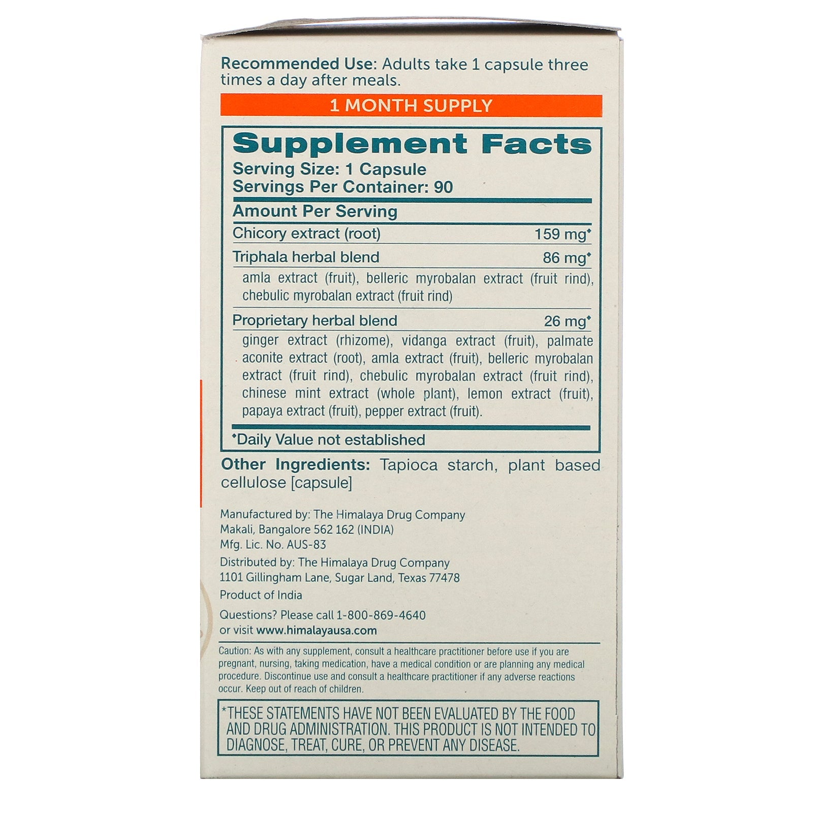 Serving Size: 1 Capsule Serving Per Container: 90 Amount Per Serving %Daily Value Chicory extract (root) 159 mg ♦ Triphala herbal blend amla extract (fruit), belleric myrobalan extract (fruit rind), chebulic myrobalan extract (fruit rind) 86 mg ♦ Proprietary herbal blend ginger extract (rhizome), vidanga extract (fruit), palmate aconite extract (root), amla extract (fruit), belleric myrobalan extract (fruit rind), chebulic myrobalan extract (fruit rind), chinese mint extract (whole plant), lemon extract (fruit), papaya extract (fruit), pepper extract (fruit). 26 mg ♦ ♦Daily Value not established.Disclaimer