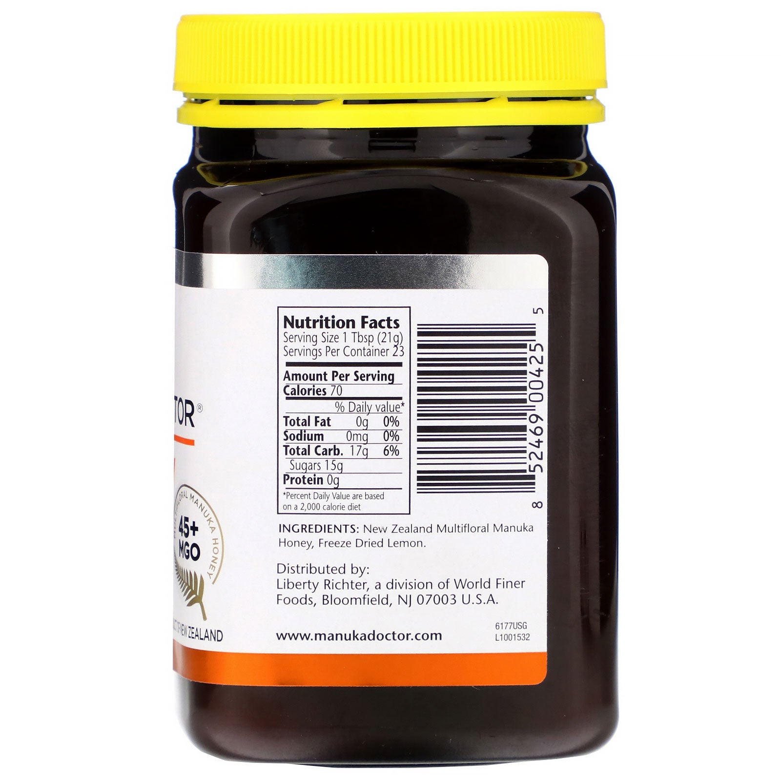 Pure New Zealand Honey Tested Certified-Guaranteed Multiflora Manuka Honey Kiwi Kosher Pareve New Zealand Made™ Manuka Doctor- the specialists in high quality New Zealand Manuka Honey. With levels certified by an independent validated laboratory, you can be assured of the rating in every batch of Manuka Doctor honey. The bio active rating is a reflection of naturally occurring peroxide activity levels. This product is guaranteed to contain at least 45+ MGO = 45 mg/kg methylglyoxal. Manuka Doctor is trusted from Hive to Home.Sugg. UseOther IngredientsNew zealand multifloral manuka honey, freeze dried lemon.Supplement FactsServing Size: 1 Tbsp (21 g) Serving Per Container: 23 Amount Per Serving %Daily Value* Calories 70 Total Fat 0 g 0% Sodium 0 mg 0% Total Carb. 17 g 6% Sugars 15 g Protein 0 g *Percent Daily Value are based on a 2,000 calorie diet.DisclaimerWhile VitaminsUK strives to ensure the accuracy of its product images and...