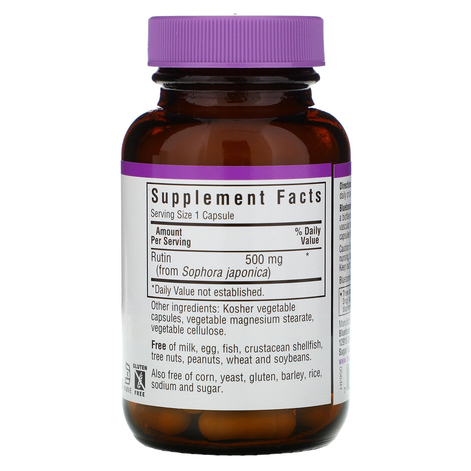 Made With Non GMO Ingredients Dietary Supplement Vegan Kosher Parve Gluten Free Bluebonnet's Rutin 500 mg Capsules contain pure rutin, a 100% natural bioflavonoid from Sophora japonica. Available in easy-to-swallow vegetable capsules for maximum assimilation and absorption.