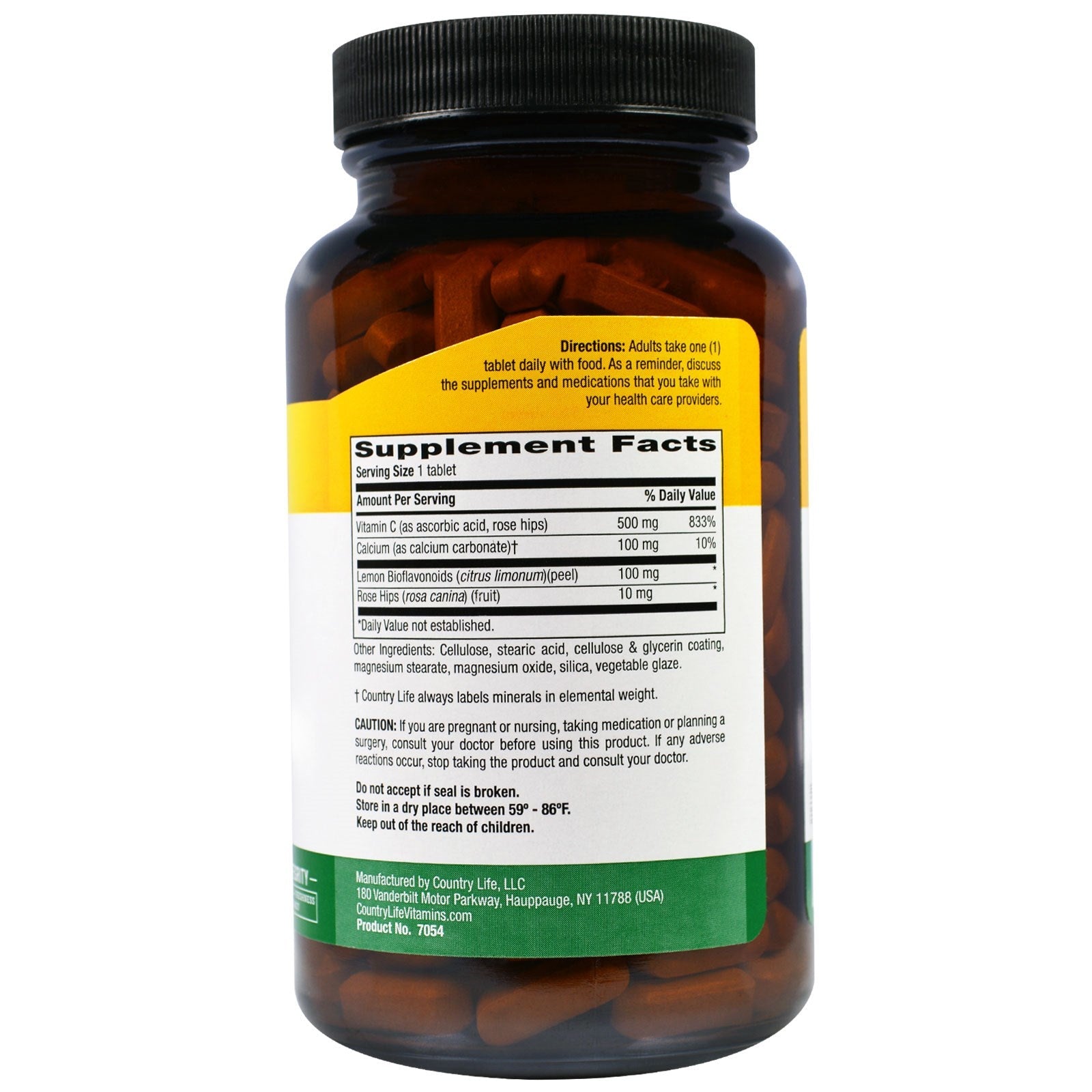 Established 1971 Includes 100 mg of Bioflavonoids Certified Gluten-Free Supports Immune Health Dietary Supplement Kosher — Our Pledge of Integrity — Authenticity Cleanliness Freshness Consistency Accuracy Country Life's Buffered Vitamin has been, prepared with natural alkaline calcium carbonate and magnesium oxide which buffer and neutralize the excess acidity of Vitamin C.Sugg. UseAdults take one (1) tablet daily with food. As a reminder, discuss the supplements and medications that you take with your health care providers.Other IngredientsCellulose, stearic acid, cellulose & glycerin coating, magnesium stearate, magnesium oxide, silica, vegetable glaze.Supplement FactsServing Size: 1 tablet Amount Per Serving: %Daily Value Vitamin C (as ascorbic acid, rose hips) 500 mg 833% Calcium (as calcium carbonate) † 100 mg 10% Lemon Bioflavonoids (citrus limonum) (peel) 100 mg * Rose Hips (rosa canina) (fruit) 10 mg * * Daily Value not established. † Country Life always labels mineral in elemental weight.DisclaimerWhile VitaminsUK strives to ensure...