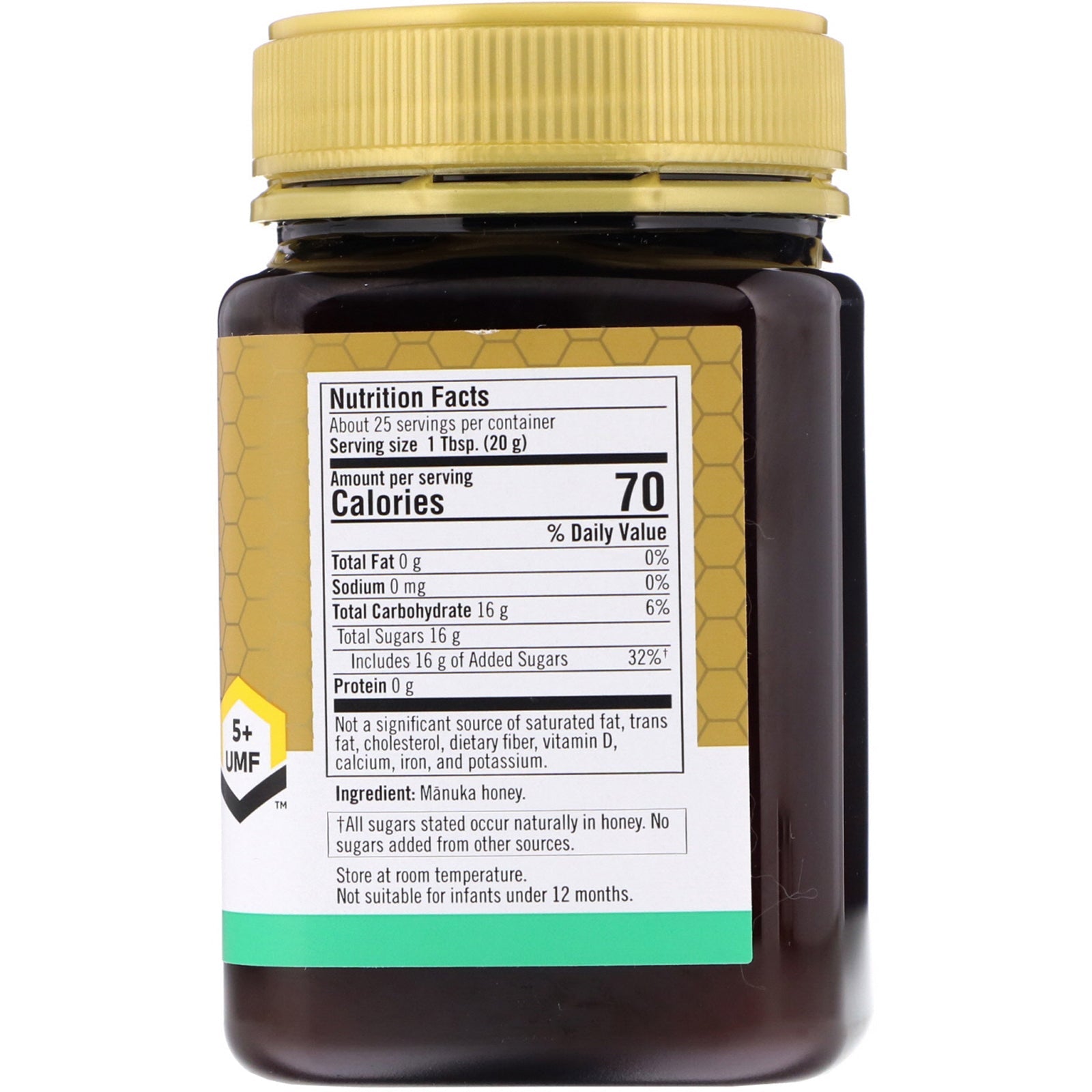 100% Pure New Zealand Quality Guaranteed Product of New Zealand 5+ UMFSugg. UseOther IngredientsManuka Honey.Supplement FactsServing Size: 1 Tbsp. (20 g) Serving Per Container: About 25 Amount Per Serving %Daily Value Calories 70 Total Fat 0 g 0% Sodium 0 mg 0% Total Carbohydrate 16 g 6% Total Sugars 16 g Includes 16 g of Added Sugars 32%† Protein 0 g Not a significant source of saturated fat, trans fat, cholesterol, dietary fiber, vitamin D, calcium, iron, and potassium. †All sugars stated occur naturally in honey. No sugars added from other sources.DisclaimerWhile VitaminsUK strives to ensure the accuracy of its product images and information, some manufacturing changes to packaging and/or ingredients may be pending update on our site. Although items may occasionally ship with alternate packaging, freshness is always guaranteed. We recommend that you read labels, warnings and directions of all products before use and not rely solely on the...
