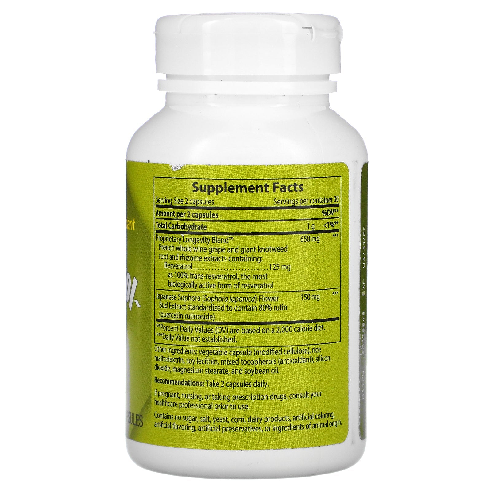Healthy Aging Antioxidant Dietary Supplement Vegetarian Synergistic formula providing superior healthy aging and immune health support! This comprehensive formula boosts antioxidant levels and supports heart health with 100% pure trans-resveratrol, the most absorbable form of resveratrol. Resveratrol-forte® uses specialized extraction and purification methods providing higher potency and stability. This unique combination of resveratrol and rutin (quercetin rutinoside) provides more healthy aging and immune support than resveratrol alone. Shield yourself from the aging effects of free radicals and oxidative stress with Resveratrol-forte! 2 capsules equal the Resveratrol in 80 bottles of red wine!† †Based on 125 mg trans-resveratrol dose, an average of 1.97 mg of trans-resveratrol per liter of red wine, and 750 ml bottle size.Sugg. UseTake 2 capsules daily.Other IngredientsVegetable capsule (modified cellulose), rice maltodextrin, soy lecithin, mixed tocopherols (antioxidant), silicon dioxide, magnesium stearate, and soybean oil. Contains no sugar, salt, yeast, corn, dairy products, artificial coloring, artificial flavoring, artificial...