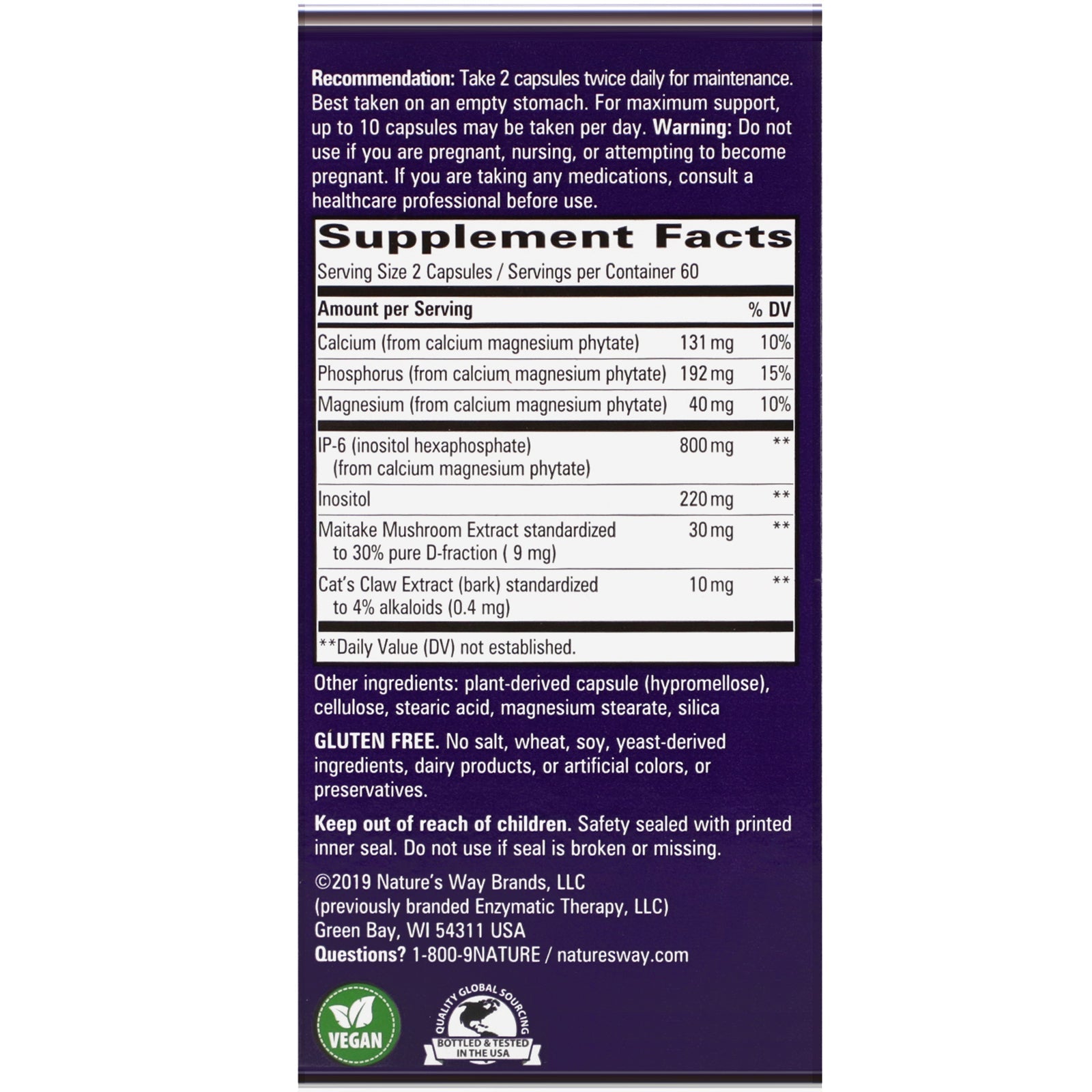 Serving Size: 2 Capsules Servings Per Container: 60 Amount Per Serving % Daily Value Calcium (from calcium magnesium phytate) 131 mg 10% Phosphorus (from calcium magnesium phytate) 192 mg 15% Magnesium (from calcium magnesium phytate) 40 mg 10% IP-6 (inositol hexaphosphate) (from calcium magnesium phytate) 800 mg ** Inositol 220 mg ** Maitake Mushroom Extract standardized to 30% pure D-fraction (9 mg) 30 mg ** Cat's Claw Extract (bark) standardized to 4% alkaloids (0.4 mg) 10 mg ** **Daily Value (DV) not established.Disclaimer