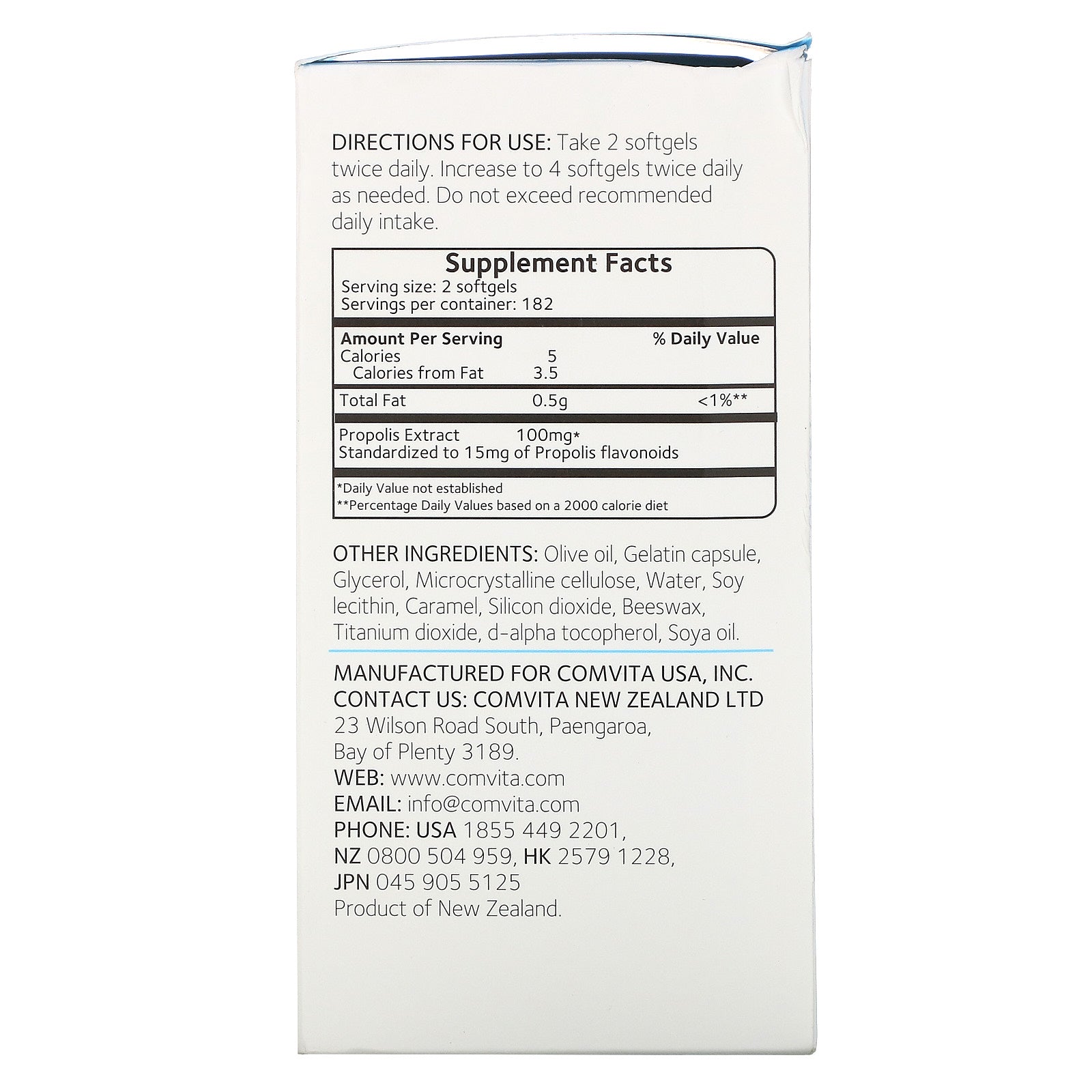 Protection Nature's Powerful Defence System Guaranteed Flavonoid Levels Supports Immune System Dietary Supplement GMP - Good Manufacturing Practice Protection: Comvita® Propolis softgels contain Propolis, which is created by bees from the natural resin produced by trees as part of their defence system. Honeybees collect the resin, mix in beeswax and enzymes, and use it to protect the hive. Comvita® Propolis contains a range of bioflavonoids with properties known to help maintain a healthy immune system. Comvita®'s PFL® stands for Propolis Flavonoid Level and refers to the flavonoid content found in 2 Propolis softgels. PFL® 15 delivers at least 15 mg of Propolis flavonoids per 2 softgels. Comvita®'s Natural Performance Process: At Comvita® we understand nature and the way our bodies work. With our proven natural performance process we harness the power of nature for your health, bringing you high performance ingredients in a pure and powerful form. Understand Research Source...