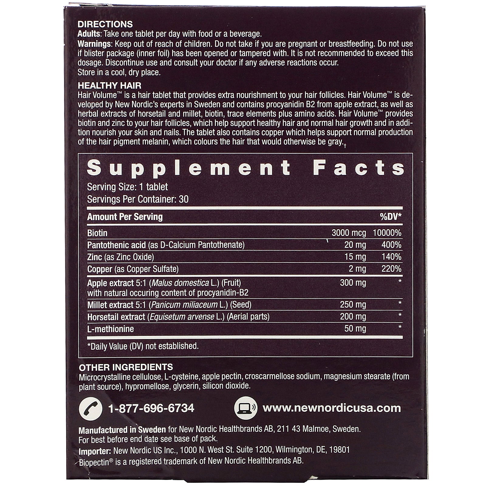 Value Pack Helps Support Healthy Hair and Normal Hair Growth Just 1 Tablet Per Day Contains Nutrients to Help Nourish Your Hair and Scalp With Botanicals Dietary Supplement No Dairy No GMO No Gluten Healthy Hair Hair Volume™ is a hair tablet that provides extra nourishment to your hair follicles. Hair Volume™ is developed by New Nordic's experts in Sweden and contains procyanidin B2 from apple extract, as well as herbal extracts of horsetail and millet, biotin, trace elements plus amino acids. Hair Volume™ provides biotin and zinc to your hair follicles, which help support healthy hair and normal hair growth and addition nourish your skin and nails. The tablet also contains copper which helps support normal production of the hair pigment melanin, which colours the hair that would otherwise be gray. Apple The Biopectin® apple extract used in these tablets has a natural content of procyanidin B2. The apples are picked, mashed, dried and extracted, so that the desired herbal substances are preserved. This guarantees the high quality.