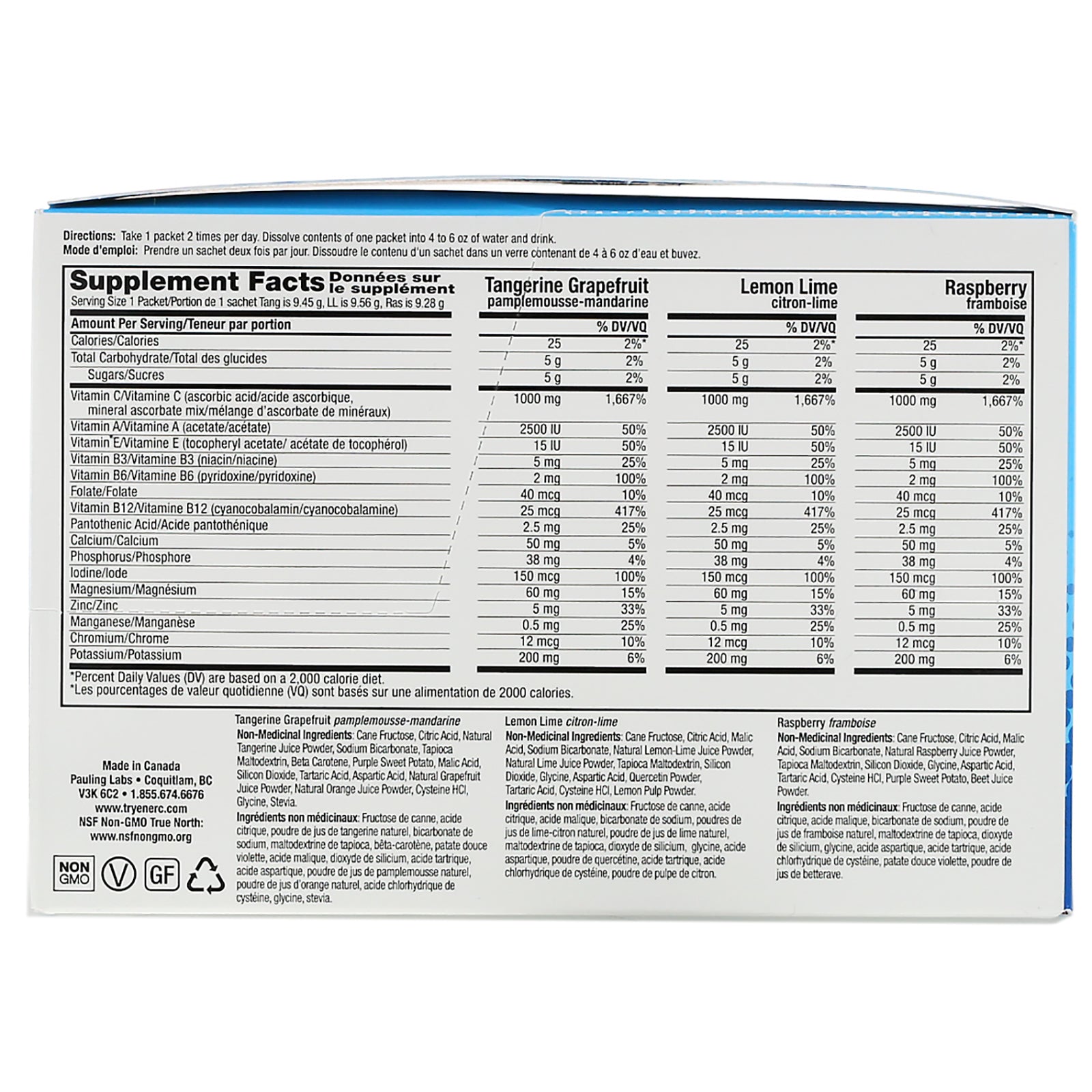 Tangerine Grapefruit Non-Medicinal Ingredients: Cane fructose, citric acid, natural tangerine juice powder, sodium bicarbonate, tapioca maltodextrin, beta carotene, purple sweet potato, malic acid, silicon dioxide, tartaric acid, aspartic acid, natural grapefruit juice powder, natural orange juice powder, cysteine HCI, glycine, stevia. Lemon Lime Non-Medicinal Ingredients: Cane fructose, citric acid, malic acid, sodium bicarbonate, natural lemon-lime juice powder, natural lime juice powder, , tapioca maltodextrin, silicon dioxide, glycine, aspartic acid, quercetin dihydrate powder, tartaric acid, cysteine HCI, lemon pulp powder. Raspberry Non-Medicinal Ingredients: Cane fructose, citric acid, malic acid, sodium bicarbonate, natural raspberry juice powder, tapioca maltodextrin, silicon dioxide, glycine, aspartic acid, tartaric acid, cysteine HCI, purple sweet potato, beet juice powder.Supplement Facts
