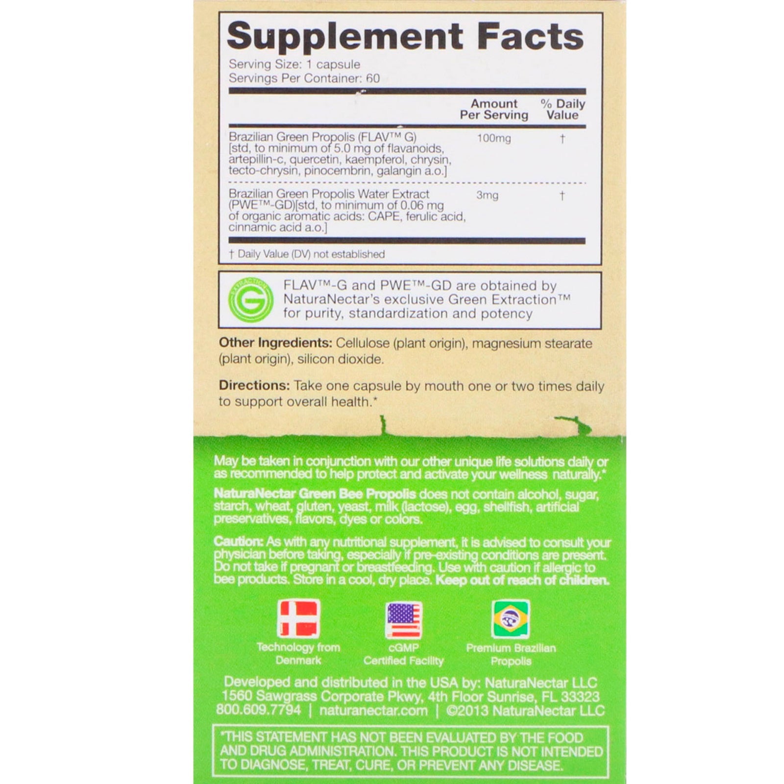 Serving Size: 1 capsule Servings Per Container: 60 Amount Per Serving %Daily Value Brazilian Green Propolis (FLAV G) [std. to minimum of 5.0 mg of flavonoids, artepillin-c, quercetin, kaempferol, chrysin, tecto-chrysin, pinocembrin, galangin a.o.] 100 mg † Brazilian Green Propolis Water Extract (PWE-GD) [std. to minimum of 0.06 mg of organic aromatic acids: CAPE, ferulic acid, cinnamic acid a.o.] 3 mg † †Daily Value (DV) not established. FLAV-G and PWE-GD are obtained by NaturaNectar's exclusive Green Extraction for purity, standardization and potency.Disclaimer