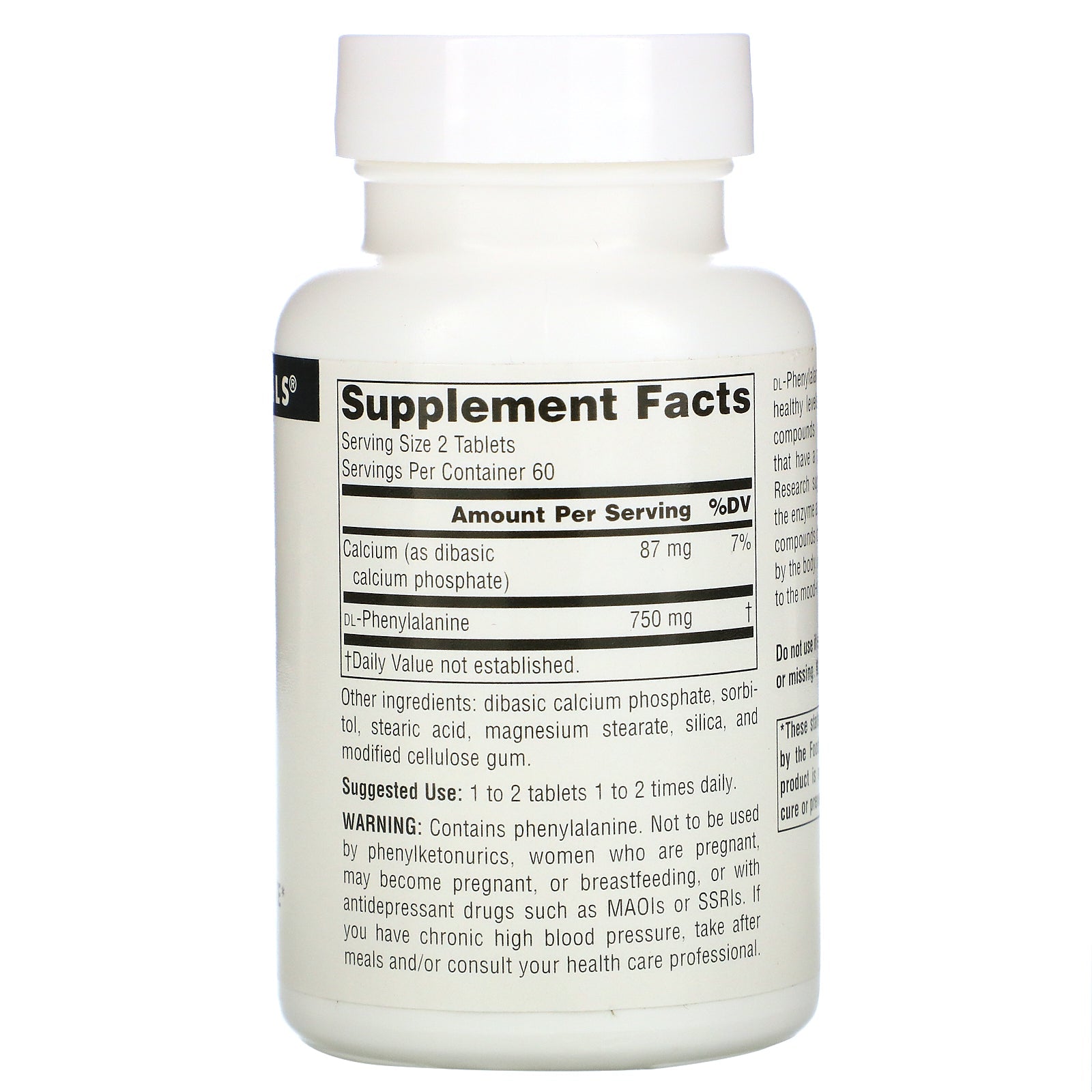 Dietary Supplement DL-Phenylalanine Supports An Alert State DL-Phenylalanine, or DLPA, May support healthy levels of endorphins and enkephalins, compounds naturally produced by the body that have a positive effect on comfort levels. Research suggests that DLPA helps regulate the enzyme action the body uses to break these compounds down, which may extend their use by the body. L-Phenylalanine is also a precursor to the mood-related neurotransmitter dopamine.Sugg. Use1 to 2 tablets 1 to 2 times daily.Other IngredientsDibasic calcium phosphate, sorbitol, stearic acid, magnesium stearate, silica, and modified cellulose gum.Supplement FactsServing Size: 2 Tablets Servings Per Container: 60 Amount Per Serving %DV Calcium (as dibasic calcium phosphate) 87 mg 7% DL-Phenylalanine 750 mg † †Daily Value not establishedDisclaimerWhile VitaminsUK strives to ensure the accuracy of its product images and information, some manufacturing changes to packaging and/or ingredients may be pending update on our site. Although items may occasionally ship with alternate...