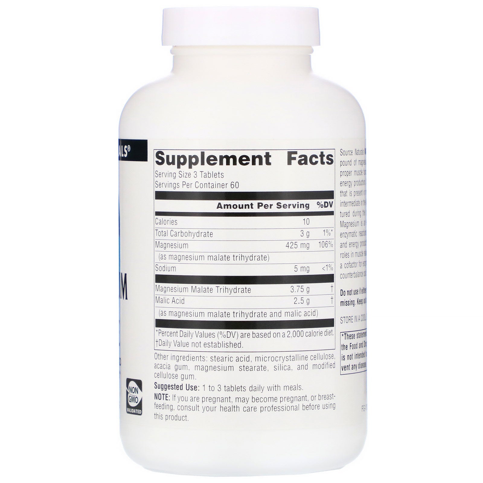 Dietary Supplement Supports Muscle and Energy Production 3,750 mg Per Serving Non GMO Validated Source Naturals Magnesium Malate is a compound of magnesium and malic acid. It supports proper muscle function, cardiovascular health, and energy production. Malic acid is a natural fruit acids that is present in most cells in the body and is an intermediate in the Krebs cycle, where energy is captured during the metabolism of carbs and fats. Magnesium is an essential cofactor for over 300 enzymatic reactions in metabolism, ATP synthesis and energy production. Magnesium plays important roles in muscle relaxation, because of its functions as a cofactor for enzymes and because of its ability to counterbalance calcium in the cell.Sugg. Use1 to 3 tablets daily with mealsOther IngredientsStearic acid, microcrystalline cellulose, acacia gum, magnesium stearate, silica, and modified cellulose gum.Supplement FactsServing Size: 3 Tablets Servings Per Container: 60 Amount Per Serving %Daily Value Calories 10...