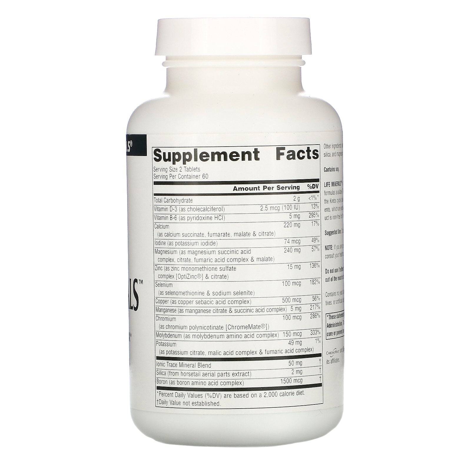 Serving Size: 2 Tablets Servings Per Container : 60 Amount Per Serving %DV Total Carbohydrate 2 g <1%* Vitamin D-3 (as cholecalciferol) 2.5 mcg (100 IU) 13% Vitamin B-6 (as pyridoxine HCl) 5 mg 295% Calcium (as calcium succinate, fumarate, malate & citrate) 220 mg 17% Iodine (as potassium iodide) 74 mcg 49% Magnesium (as magnesium succinic acid complex, citrate, fumaric acid complex & malate) 240 mg 57% Zinc (as zinc monomethionine sulfate complex [OptiZinc ®] & citrate) 15 mg 136% Selenium (as selenomethionine & sodium selenite) 100 mcg 182% Copper (as copper sebacic acid complex) 500 mcg 56% Manganese (as manganese citrate & succinic acid complex) 5 mg 217% Chromium (as chromium polynicotinate [ChromeMate ® ]) 100 mcg 286% Molybdenum (as molybdenum amino acid complex) 150 mcg 333% Potassium (as potassium citrate, malic acid complex & fumaric acid complex) 49 mg 1% Ionic Trace Mineral Blend 50 mg † Silica (from horsetail aerial parts extract) 2 mg † Boron (as boron amino acid complex) 1500 mcg † * Percent Daily Values (%DV) are based on a 2,000 calorie diet. †Daily Value not established.Disclaimer