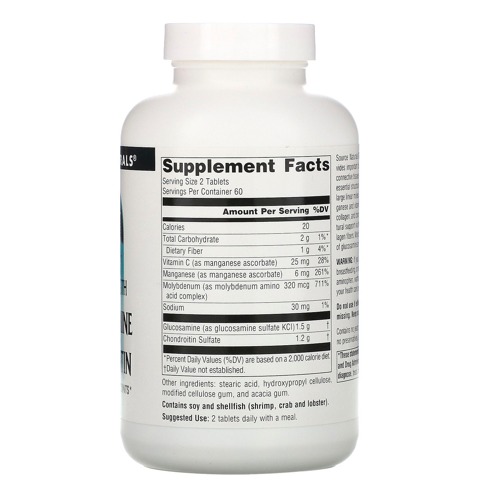 Dietary Supplement Promotes Healthy Joints Source Naturals Glucosamine Chondroitin provides important building blocks for healthy joints and connective tissues. Glucosamine, an amino sugar, is an essential structural component of glycosaminoglycans, large linear molecules that help to lubricate joints. Manganese and vitamin C are involved in the synthesis of collagen, and chondroitin sulfate lends additional structural support via its high degree of interaction with collagen fibers. Molybdenum aids in complete metabolism of glucosamine and chondroitin.Sugg. Use2 tablets daily with a meal.Other IngredientsStearic acid, hydroxypropyl cellulose, modified cellulose gum, and acacia gum. Contains soy and shellfish (shrimp, crab and lobster). Contains no yeast, dairy, egg, gluten, or wheat. Contains no preservatives, or artificial color, flavor or fragrance.Supplement FactsServing Size: 2 Tablets Servings Per Container: 60 Amount Per Serving %DV Calories 20 Total Carbohydrate 2 g 1%* Dietary Fiber 1 g 4%* Vitamin C (as manganese ascorbate) 25 mg 28% Manganese (as manganese...