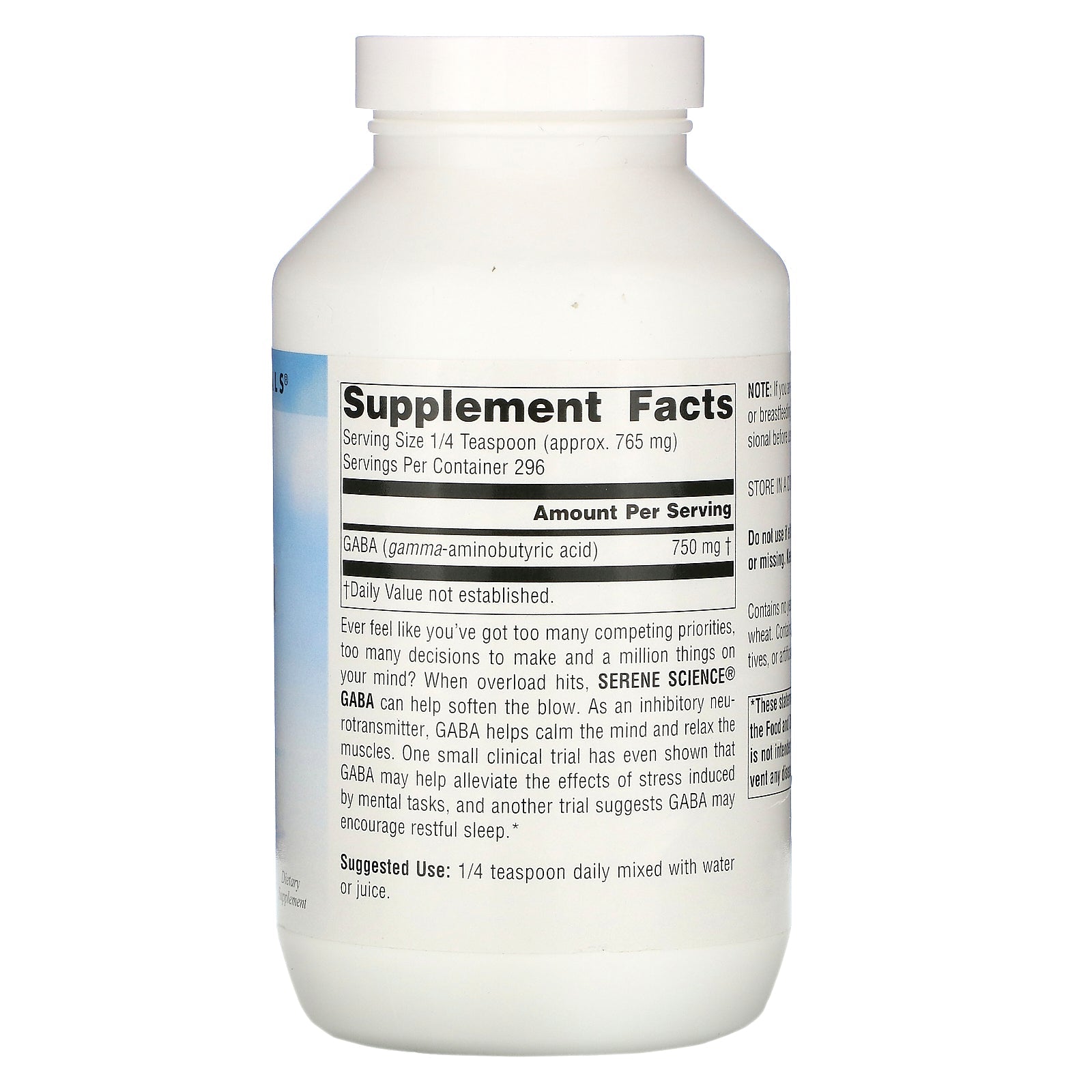 Serene Science® Calm Mind Dietary Supplement Ever feel like you've got too many competing priorities, too many decisions to make and a million things on your mind? When overload hits, Serene Science® Gaba can help soften the blow. As an inhibitory neurotransmitter, GABA helps calm the mind and relax the muscles. One small clinical trial has even shown that GABA may help alleviate the effects of stress induced by mental tasks, and another trial suggests GABA may encourage restful sleep.Sugg. Use1/4 teaspoon daily mixed with water or juice.Other IngredientsContains no yeast, dairy, egg, gluten, corn, soy or wheat. Contains no sugar, starch, salt, preservatives, or artificial color, flavor or fragrance.Supplement FactsServing Size: 1/4 Teaspoon (approx. 765 mg) Servings Per Container: 296 Amount Per Serving % Daily Value GABA (gamma-aminobutyric acid) 750 mg † †Daily Value not established.DisclaimerWhile VitaminsUK strives to ensure the accuracy of its product images and information, some...