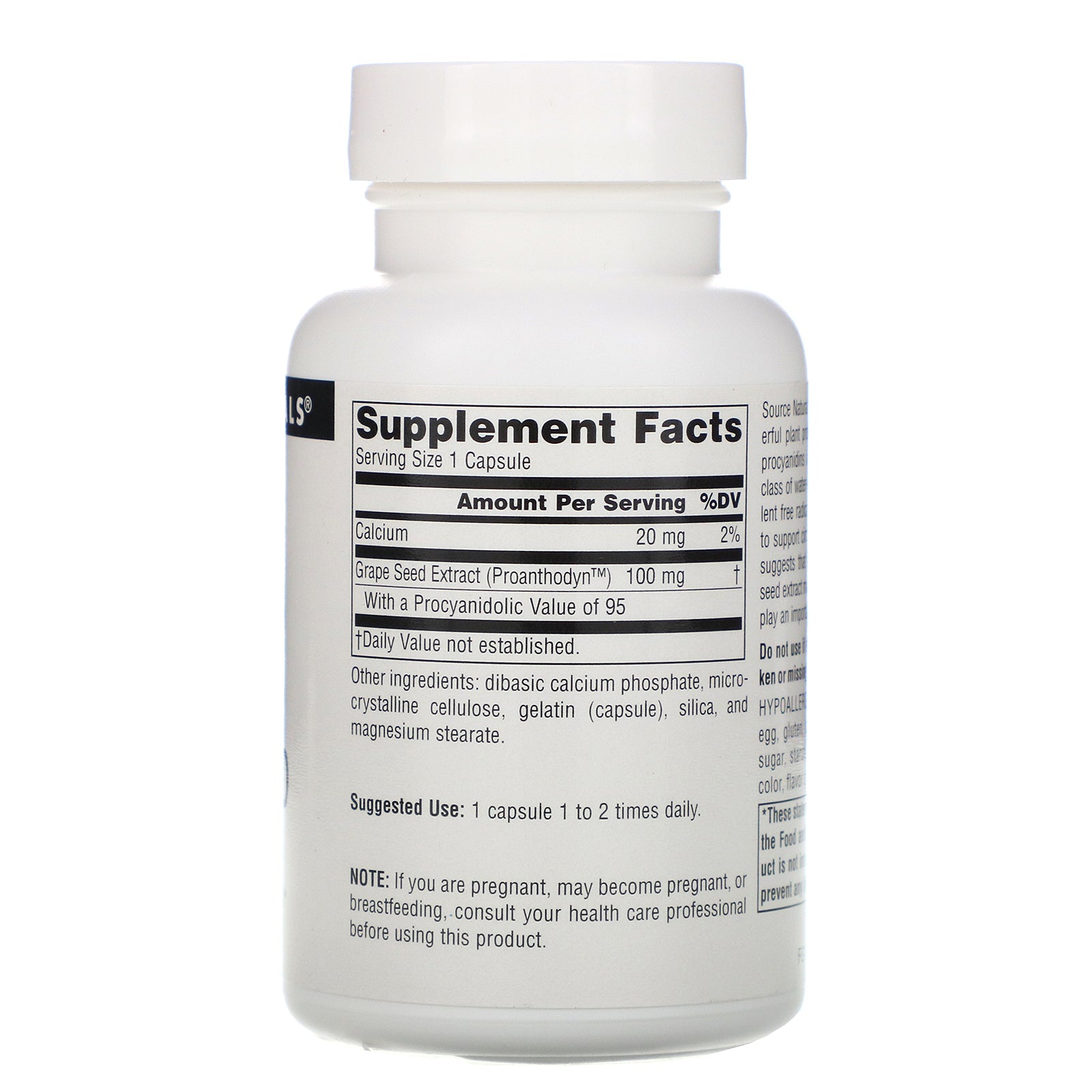 Dietary Supplement Antioxidant Protection Source Naturals Grape Seed Extract is a powerful plant product from whole grape seeds. The procyanidins in grape seed extract are a special class of water-soluble bioflavonoids that are excellent free radical scavengers that have been shown to support circulatory health. Preliminary research suggests that the antioxidant protection of grape seed extract may support a healthy aging brain, and play an important role in maintaining good health.Sugg. Use1 capsule 1 to 2 times daily.Other IngredientsDibasic calcium phosphate, microcrystalline cellulose, gelatin (capsule), silica, and magnesium stearate. Hypoallergenic: contains no yeast, dairy, egg, gluten, corn, soy or wheat. Contains no sugar, starch, salt, preservatives or artificial color, flavor or fragrance.Supplement FactsServing Size: 1 Capsules Amount Per Serving %Daily Value Calcium 20 mg 2% Grape Seed Extract (Proanthodyn™) With a Procyanidolic Value of 95 100 mg † †Daily Value not established.DisclaimerWhile VitaminsUK strives to ensure the accuracy of its...